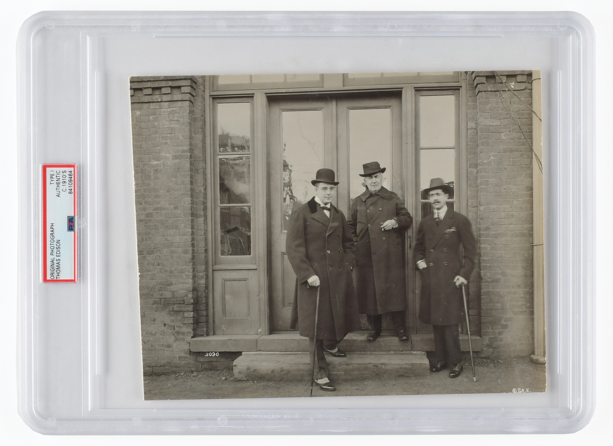 Sharp original vintage circa 1910s glossy 9.25 x 7.5 photograph of Thomas Edison with two dapper gentlemen outdoors, all wearing long overcoats. Inherent to the image is a small "TAE" copyright notation. The photograph has been professionally linen-backed. Encapsulated by PSA and certified as an authentic "Type I" photograph. In fine condition.