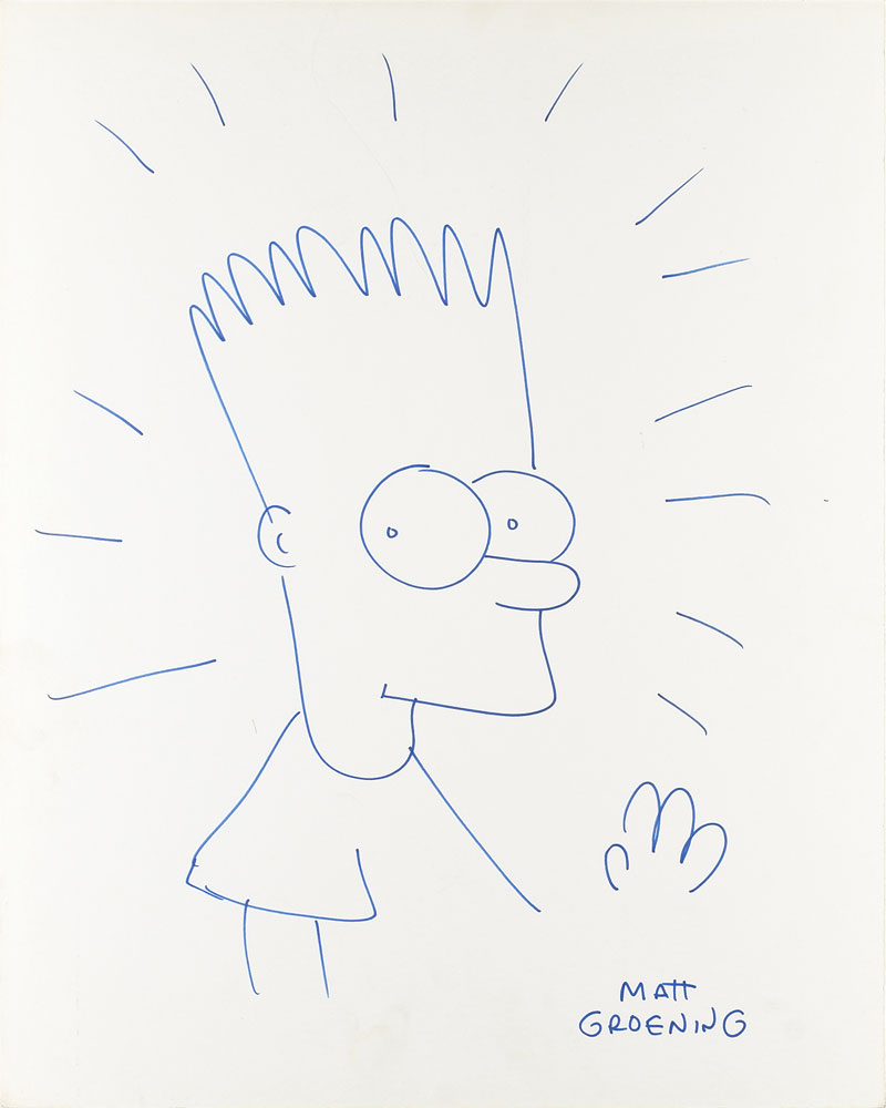 Original blue felt tip sketch of Bart Simpson waving on a white 16 x 20 cardstock sheet, signed below by Matt Groening. In fine condition, with some light fingerprint smudges on the left edge. From The John Brennan In-person Autograph Collection.