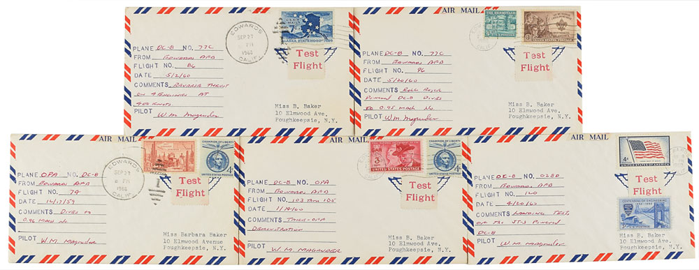 Group of five flown covers carried on test flights of the Douglas DC-8, each with a stamped cachet filled out with the flight's information and signed by test pilot William M. Magruder. Dates include: December 17, 1959 (with enclosed note by Magruder: "This card was carried in DC-8 OPA during high Mach No. tests at EAFB on 12/17/59. These tests completed high speed demonstration for the JT-4 powered DC-8"); January 14, 1960 ("Take-off Demonstration"); April 20, 1960 ("Landing tests of the JT-3 powered DC-8"); May 2, 1960 ("Reverse thrust on 4 engines at 400 knots"); and May 20, 1960 ( "Rolls Royce powered DC-8 dives to 0.95 Mach No"). In overall fine condition.