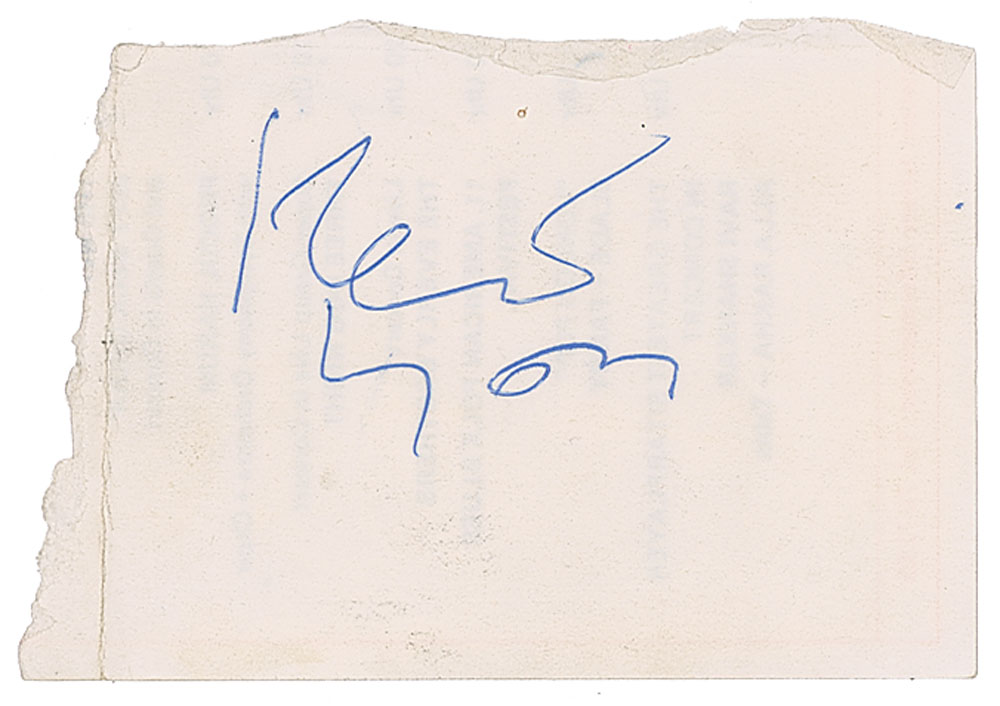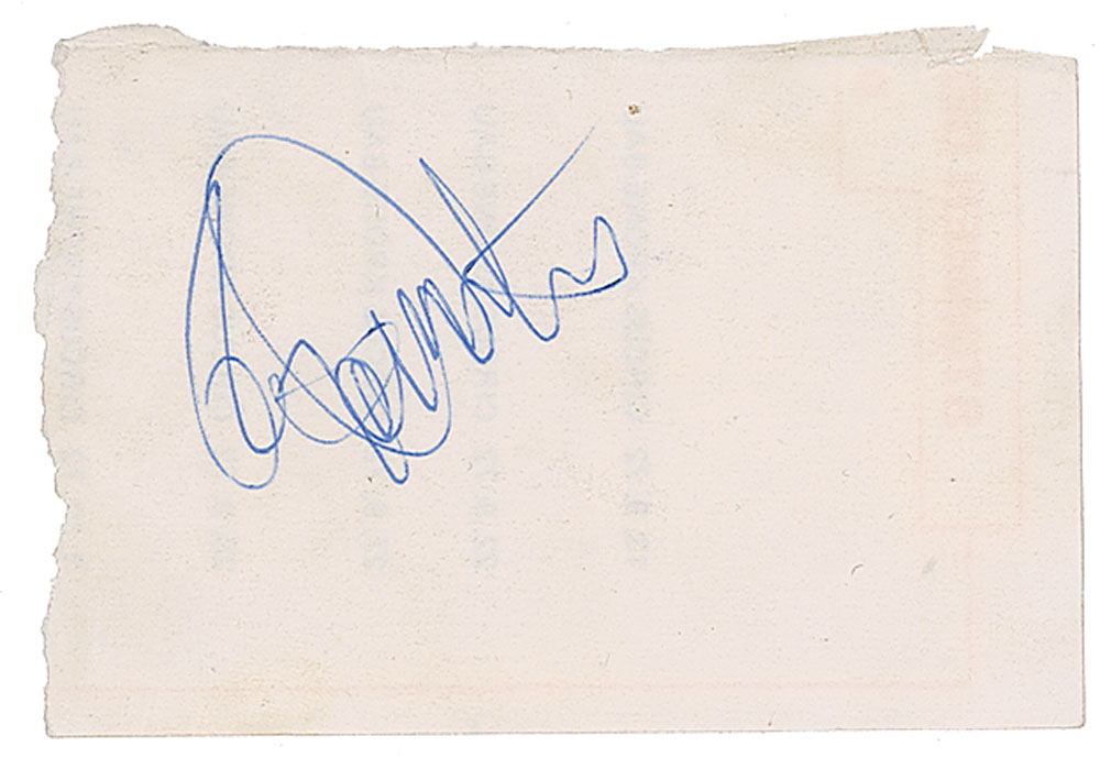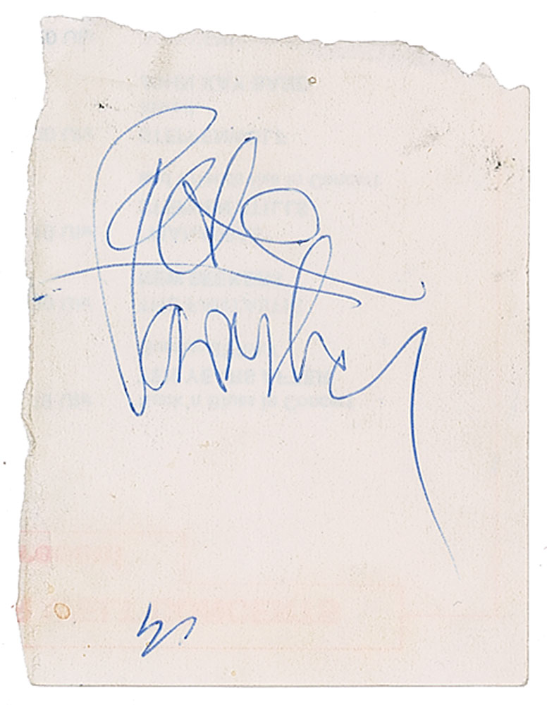 Vintage ballpoint signatures of Keith Moon, John Entwistle, Pete Townshend, and Roger Daltrey on individual off-white slips ranging in size from 4.5 x 3 to 3.25 x 4.25; when fit together, the signed slips form the reverse of a German 'Tune the World' concert schedule for September and October 1972. In fine condition, with light soiling and edge wear. Accompanied by a ticket for a Who concert at the Deutsches Museum in Munich on September 4, 1972, and a letter of provenance from the original recipient: "When I was at the concert…a good friend of mine worked there as a kind of security guy…The band before the Who was 'Golden Earring' and I asked my friend…if he can get me autographs from them…He just walked round the corner for about 5 minutes and then gave me the autographs from 'The Who.' He said they had not any [promo photographs] backstage and then 'the guy with the long blond hair took a flyer which was lying around, divided it into 4 pieces and everyone signed one sheet.'"