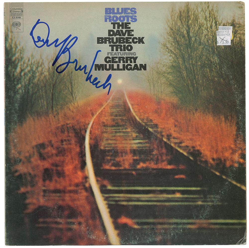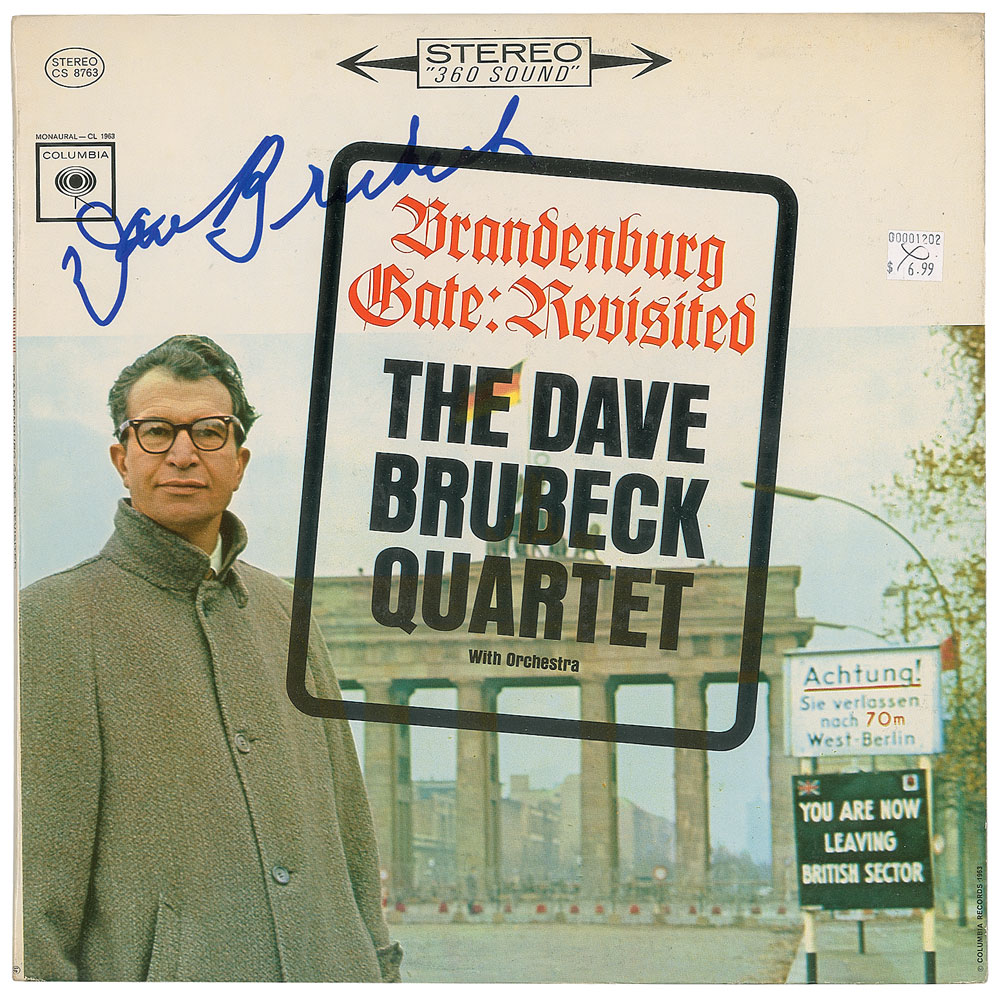 Three albums signed on the front cover in blue felt tip by Dave Brubeck: Blues Roots, Brandenburg Gate: Revisited, and Jazz Impressions of Eurasia. In overall fine condition, with price stickers on each album. The records are included. From The John Brennan In-person Autograph Collection.