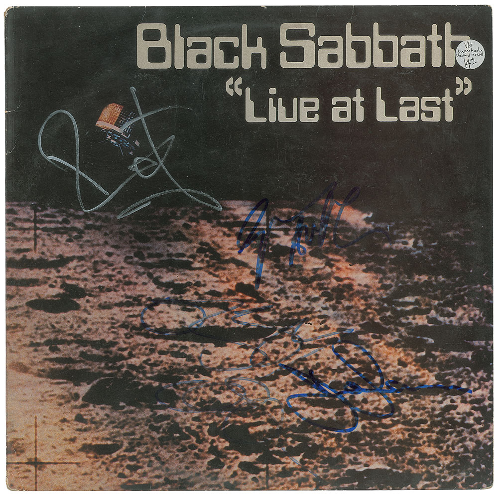 Live at Last album signed on the front cover in blue felt tip Tony Iommi, Geezer Butler, and Ozzy Osbourne, and in silver ink by Bill Ward. In very good to fine condition, with separation along the top edge, an affixed price sticker, and generally poor signature contrast. The record is included. From The John Brennan In-person Autograph Collection.