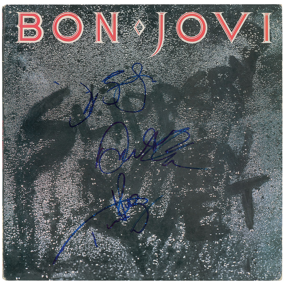 Slippery When Wet album signed on the front cover in blue felt tip by Jon Bon Jovi, Richie Sambora, Tico Torres, and David Bryan. In fine condition, with creasing to the upper left corner. The record is included. From The John Brennan In-person Autograph Collection.