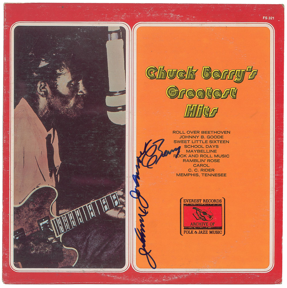 Chuck Berry's Greatest Hits album signed on the front cover in blue felt tip by Chuck Berry and Johnnie Johnson. In fine condition, with light scuffing. The record is included. From The John Brennan In-person Autograph Collection.