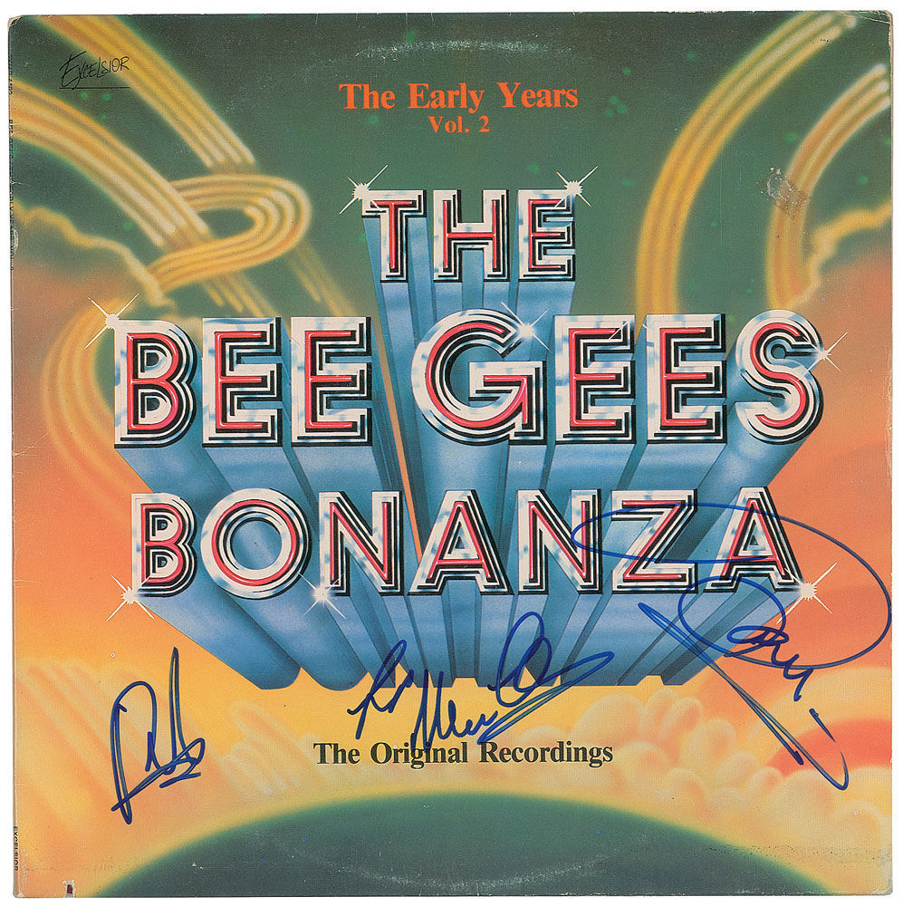 The Bee Gees Bonanza: The Early Years, Vol. 2 album signed on the front cover in blue felt tip, "Robin," "Barry," and "Love, Maurice Gibb." In very good to fine condition, with light scuffing, an affixed price sticker, and a small discount cut to the bottom edge. The record is not included. From The John Brennan In-person Autograph Collection.