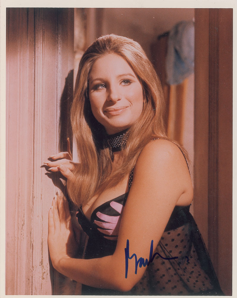 Color glossy 8 x 10 photo of Barbra Streisand as Doris from the 1970 film The Owl and the Pussycat, signed in blue felt tip, "Barbra." In fine condition. From The John Brennan In-person Autograph Collection.