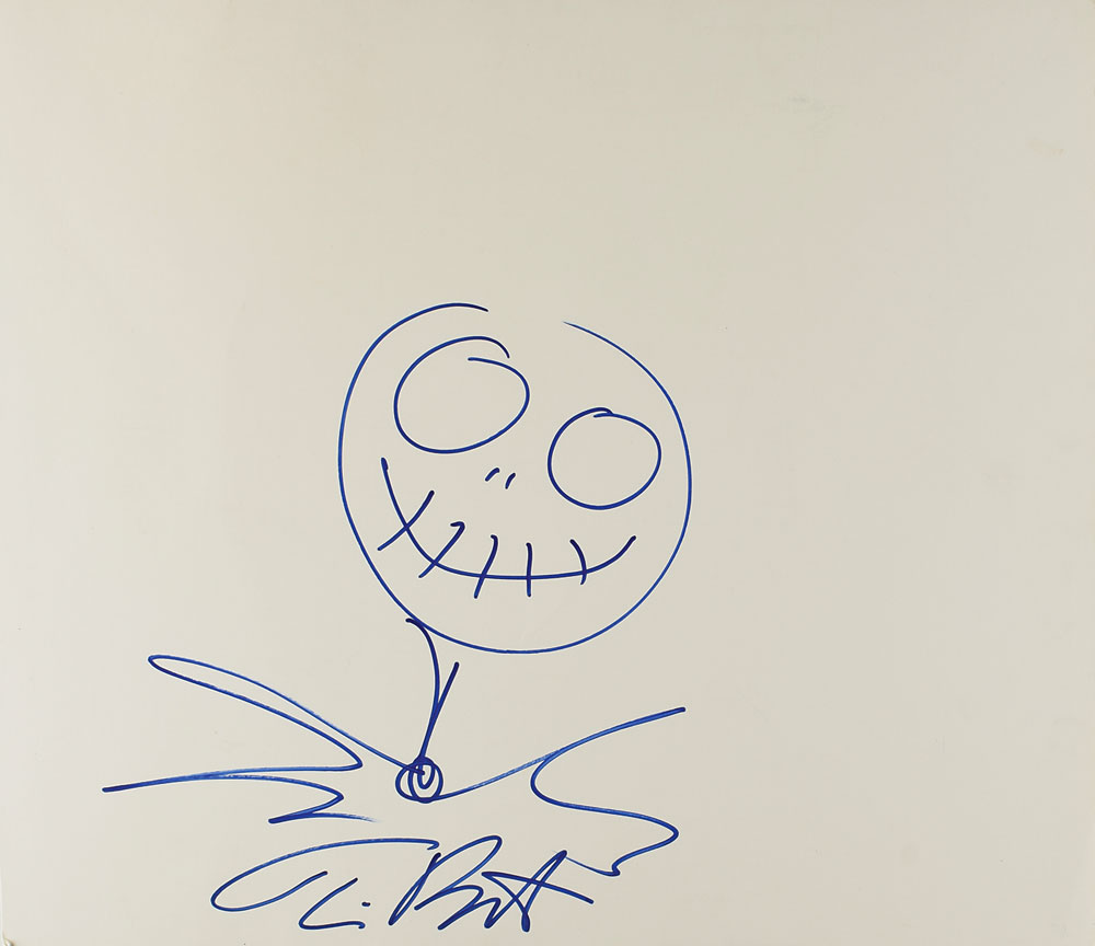 Original felt tip sketch of Jack Skellington from the 1993 animated dark fantasy The Nightmare Before Christmas on an off-white 18.25 x 16 cardstock sheet, signed below by Tim Burton. In fine condition, with a few light creases and a slightly irregular left edge. From The John Brennan In-person Autograph Collection.