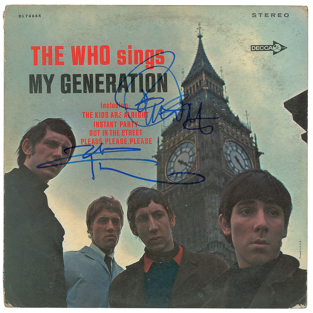 The Who Sings My Generation album signed on the front cover in blue felt tip by Roger Daltrey and Pete Townshend. In fine condition, with light scuffing, and a few stains to the back cover. The record is included. From The John Brennan In-person Autograph Collection.