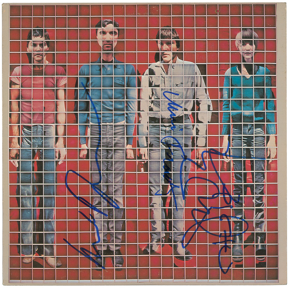 More Songs About Buildings and Food album signed on the front cover in blue felt tip by David Byrne, Chris Frantz, Jerry Harrison, and Tina Weymouth. In fine condition. The record is included. From The John Brennan In-person Autograph Collection.