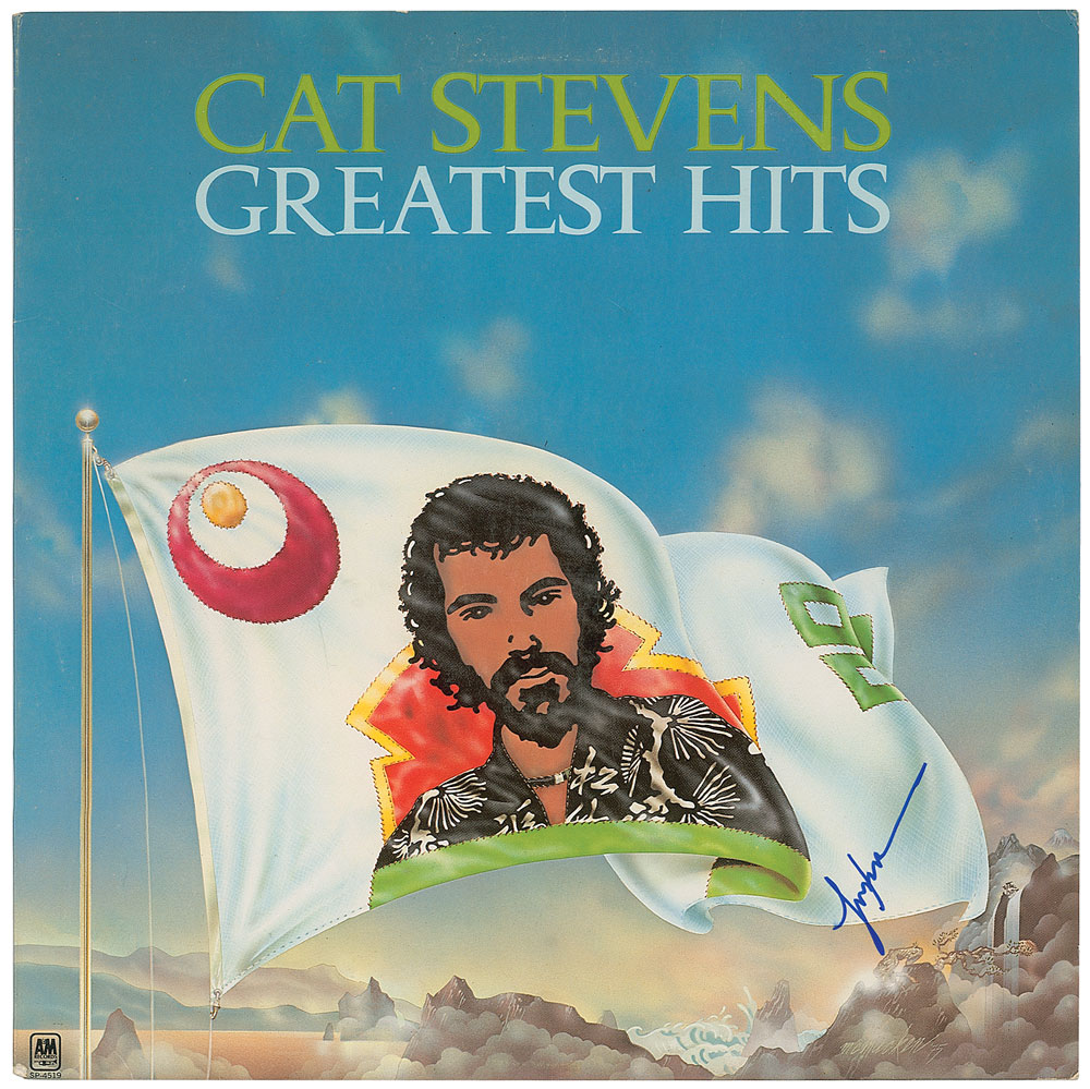 Greatest Hits album signed on the front cover in blue felt tip by Stevens as Yusuf Islam. In fine condition. The record is not included. From The John Brennan In-person Autograph Collection.