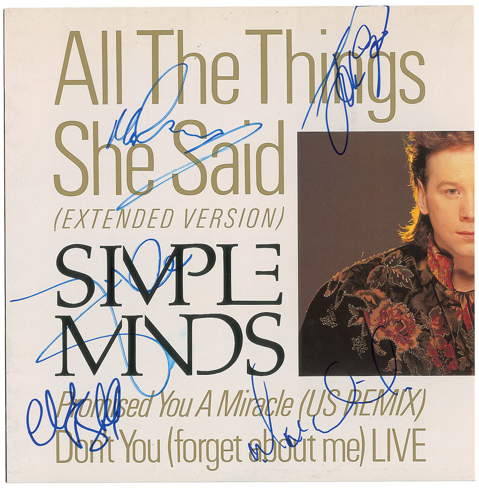 'All the Things She Said / Promised You a Miracle / Don't You (Forget About Me) (Live)' single album signed on the front cover in blue felt tip by Jim Kerr, Charlie Burchill, Michael MacNeil, Mel Gaynor, and John Giblin. In fine condition. The record is included. From The John Brennan In-person Autograph Collection.