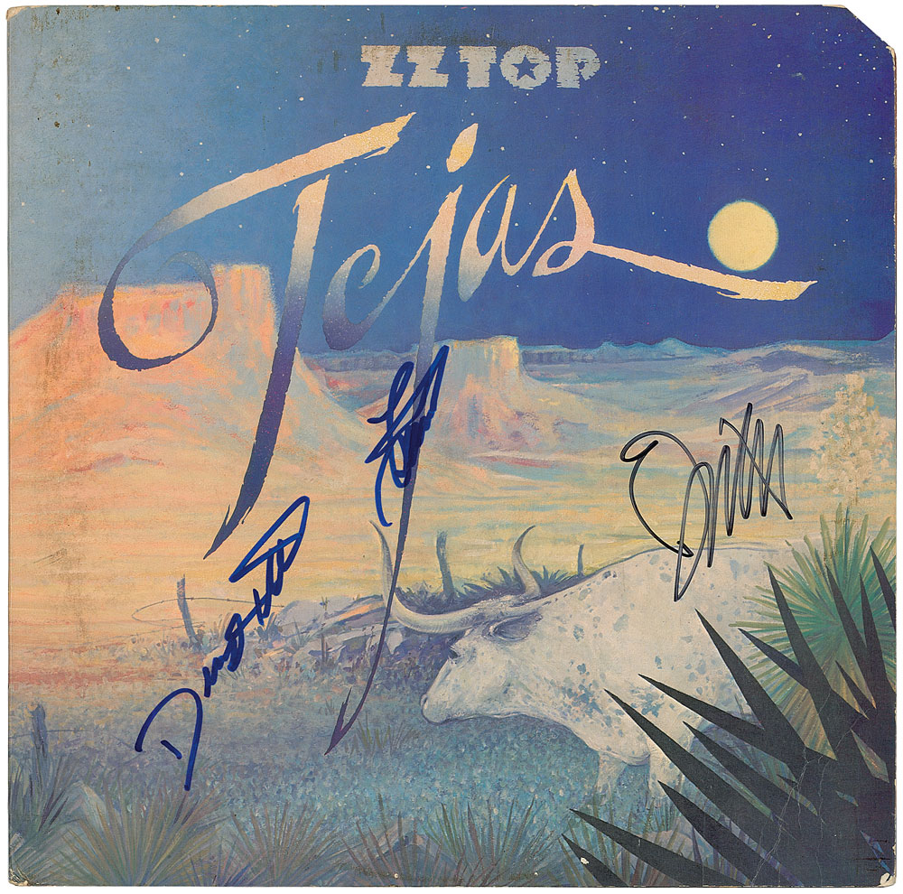 Tejas album signed on the front cover in blue felt tip by Dusty Hill and Frank Beard, and in black felt tip by Billy Gibbons. In fine condition, with a clipped upper right corner. The record is included. From The John Brennan In-person Autograph Collection.