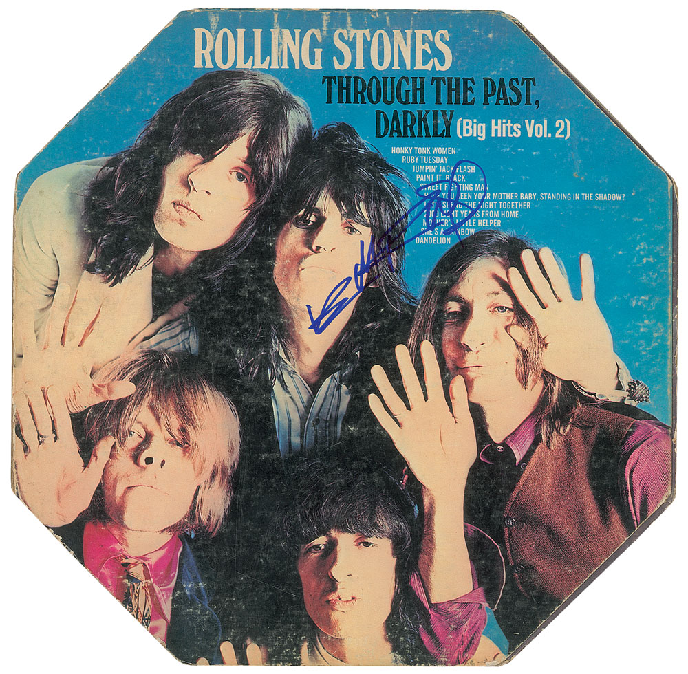 Through the Past, Darkly (Big Hits Vol. 2) album signed on the front cover in blue felt tip by Keith Richards. In very good to fine condition, with moderate scuffing, edge wear, and partial separations. The record is included. From The John Brennan In-person Autograph Collection.