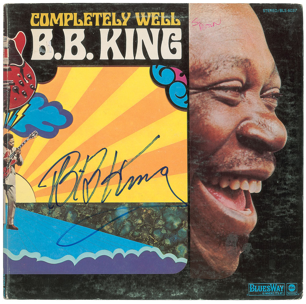 Completely Well album signed on the front cover in blue felt tip by B. B. King. In fine condition, with some old price sticker residue, and an ownership notation on King's forehead. The record is included. From The John Brennan In-person Autograph Collection.