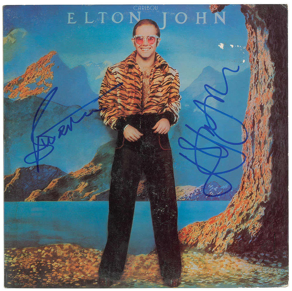 Caribou album signed on the front cover in blue felt tip by Elton John and Bernie Taupin. In fine condition, with some small bits of surface loss from a removed price sticker. The record is included. From The John Brennan In-person Autograph Collection.