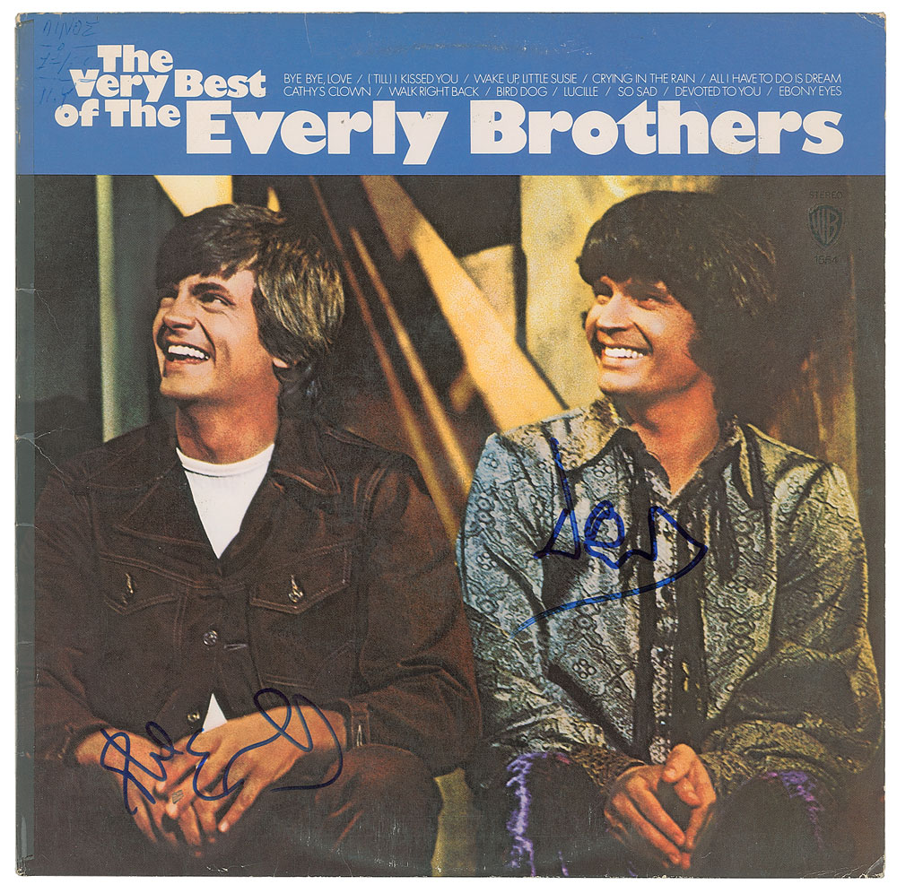 The Very Best of the Everly Brothers album signed on the front cover in blue felt tip by Phil and Don Everly. In very good to fine condition, with light scuffing, scotch tape along the left edge, and an owner's notation on the upper left corner. The record is included. From The John Brennan In-person Autograph Collection.