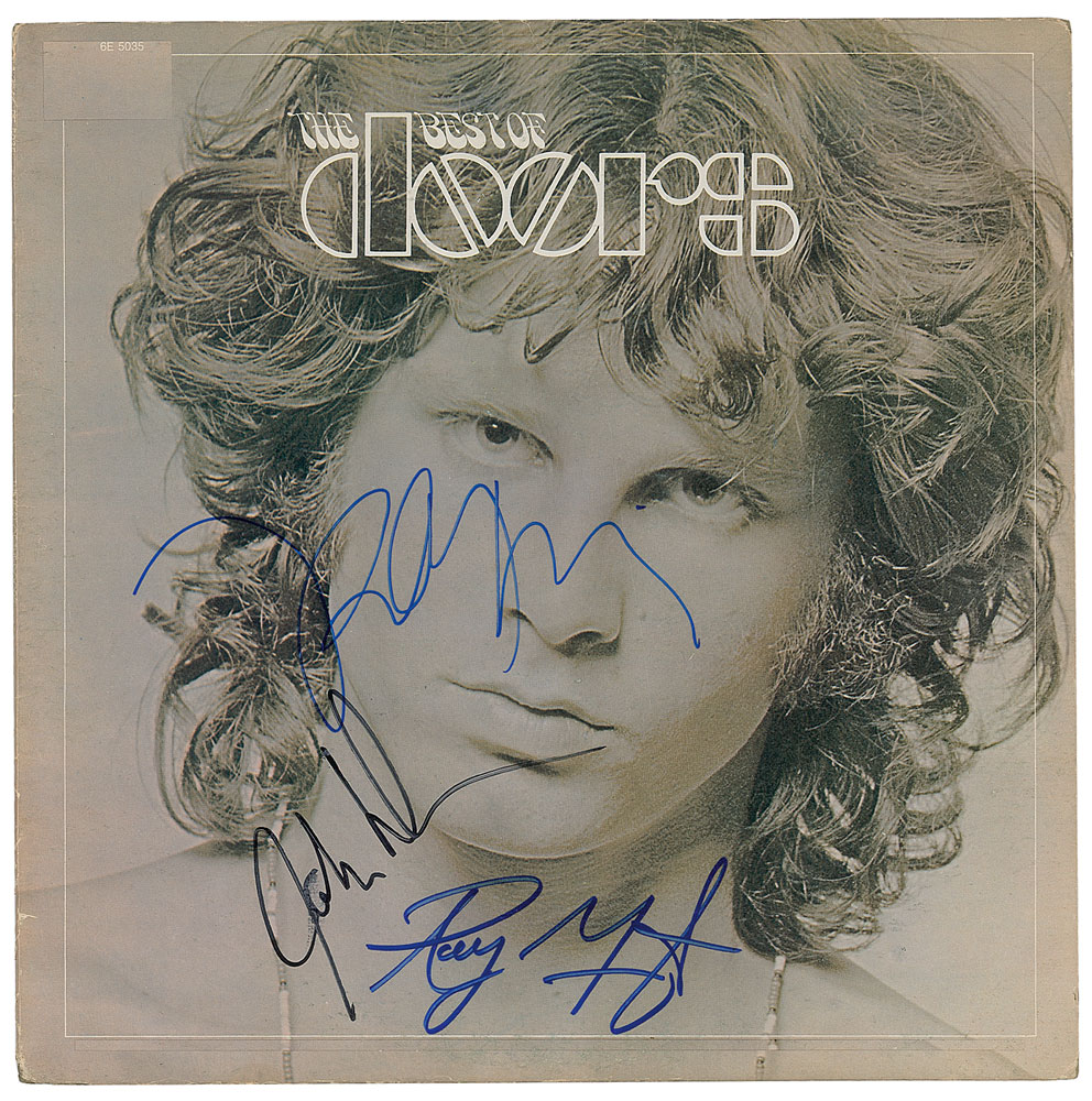 The Best of the Doors album signed on the front cover in blue felt tip by Ray Manzarek and Robby Krieger, and in black felt tip by John Densmore. In fine condition. The record is not included. From The John Brennan In-person Autograph Collection.