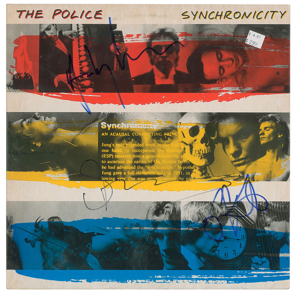 Synchronicity album signed on the front cover in blue felt tip by Stewart Copeland and Andy Summer, and in black felt tip by Sting. In fine condition, with a price sticker affixed to both front and back covers. The record is included. Featuring hit singles like 'Every Breath You Take' and 'Wrapped Around Your Finger,' Synchronicity is the band's most successful release, and an album that earned them three Grammys at the 1984 awards ceremony. From The John Brennan In-person Autograph Collection.