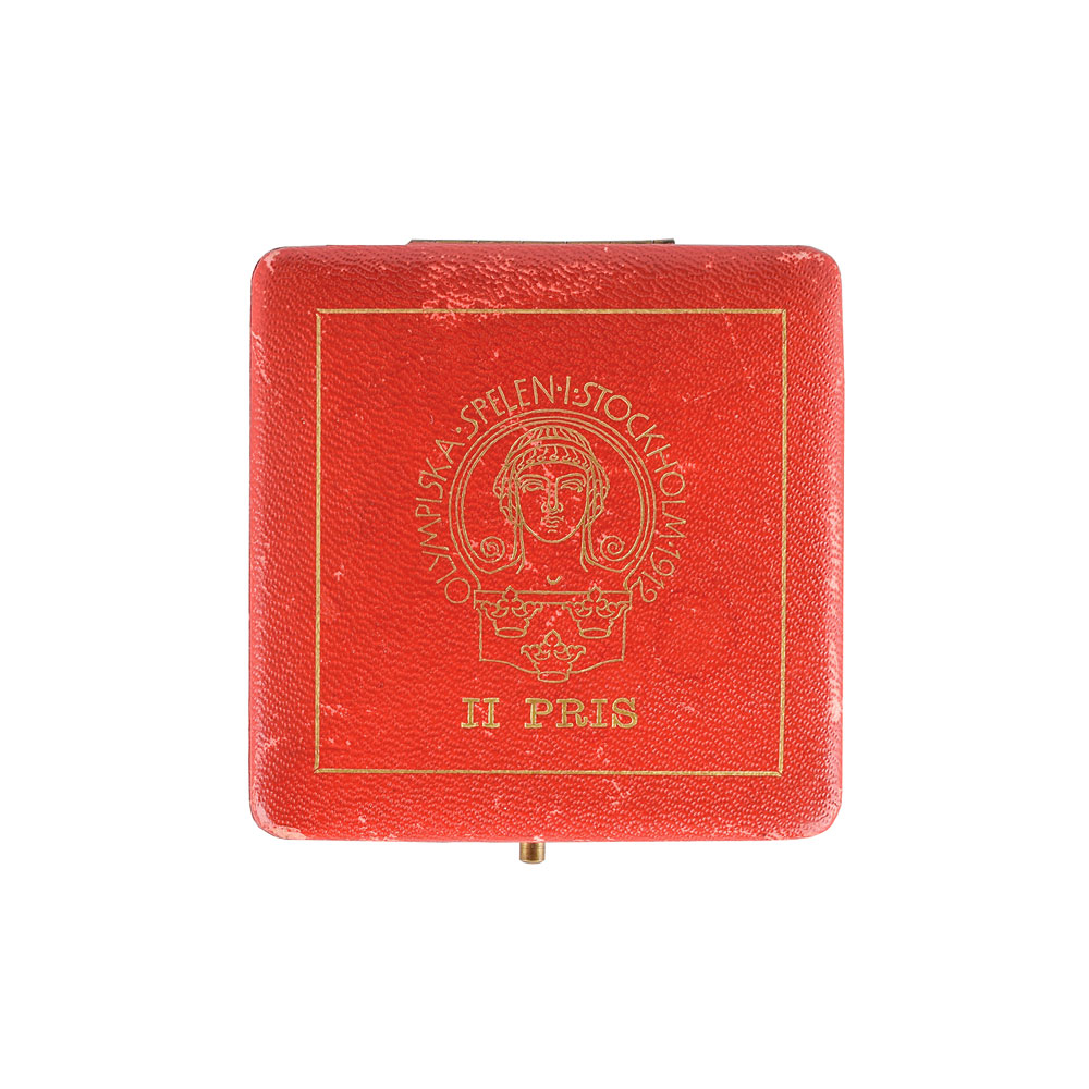 Beautiful winner's medal issued for the Stockholm 1912 Summer Olympics. Silver, 18 gm, 33 mm, by Bertram Mackennal and Erik Lindberg; manufactured by C. C. Sporrong & Co., of Stockholm, Sweden. The front depicts a victorious athlete with palm branch being crowned with a laurel wreath by two seated females; the reverse, encircled with the text, "Olympiska Spelen I Stockholm," features a herald proclaiming the opening of the Olympic Games, with a bust of Ling, the founder of Swedish gymnastics, in the background. The front of the medal, designed by Mackennel, was originally used on the winner's medals for the 1908 London Summer Olympics. Also includes its attractive original red leather presentation case. From The Mason Dinehart Collection.