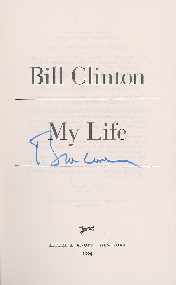 Signed book: My Life. First edition. NY: Alfred A. Knopf, 2004. Hardcover with dust jacket, 6.5 x 9.5, 957 pages. Signed on the title page in blue felt tip by Bill Clinton. In fine condition, with a partial separation to upper hinge. Accompanied by a limited edition bookplate, No. 1409, noting that the book was purchased from The Second Story Bookshop on June 22, 2004.