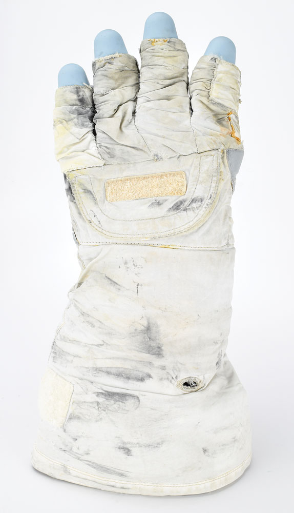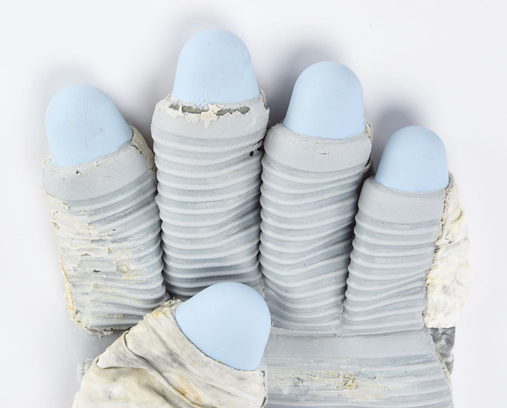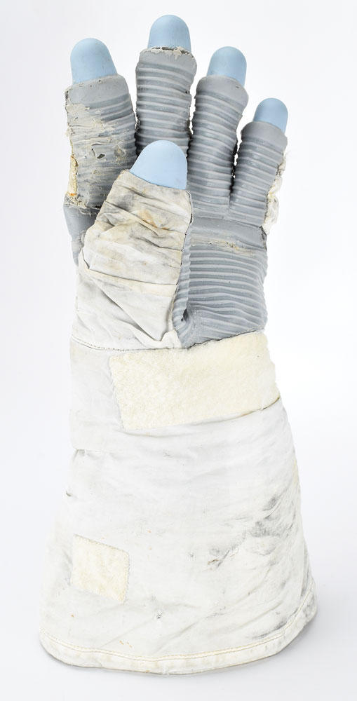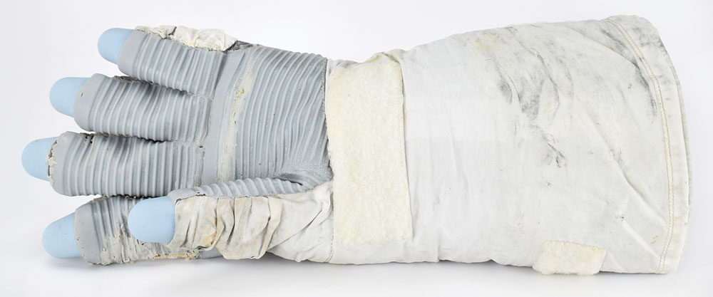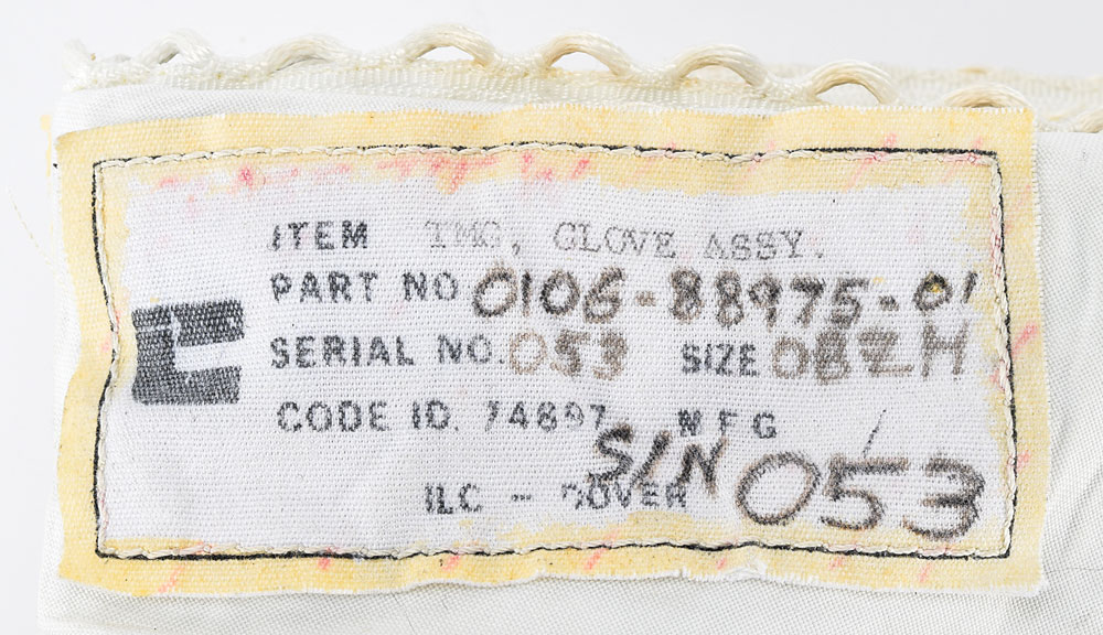 Desirable left-handed 4000 series Space Shuttle glove TMG (Thermal Micrometeoroid Garment), with an ILC-Dover tag on the interior, reading: "Item: TMG, Glove Assy., Part No. 0106-88975-01, Serial No. 053, Size OBZH, Code ID. 74897." The glove TMG features a gray palm with blue fingertips. Includes the JSC Project Parts Tag and deaccession bag. In very good condition, with heavy wear to the exterior. The TMG is the outermost layer of the spacesuit and provides insulation, radiation shielding, and protection from micrometeorites that could otherwise puncture the suit.