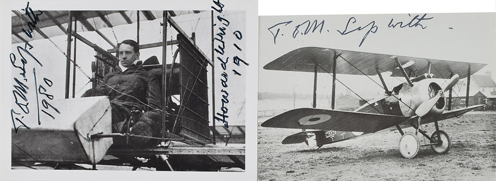 Inventor of the biplane used in WWI called the Sopwith Camel (1888-1989). Two photos: a glossy 6.5 x 4.5 photo of Thomas Sopwith seated at the controls of his Howard Wright 1910 Biplane, signed vertically in black felt tip, "T.O.M. Sopwith, 1980, Howard Wright, 1910"; and a semi-glossy 6 x 4 postcard photo of a Sopwith Camel F1 single-seat fighter, signed in black felt tip, "T.O.M. Sopwith." In overall fine condition.