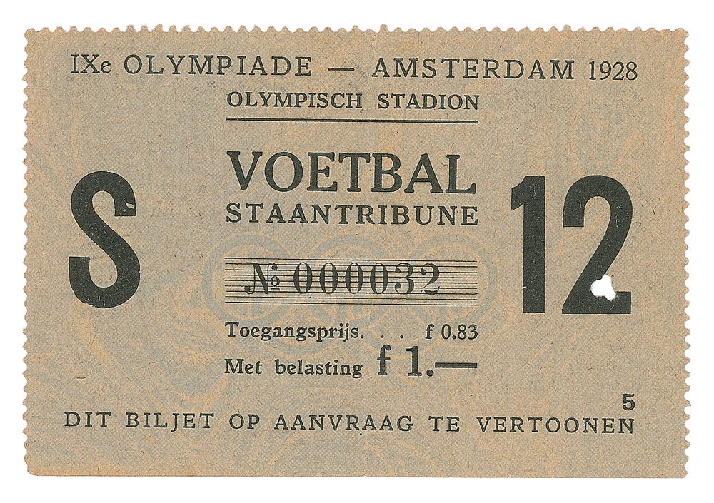 Official admittance ticket for the Amsterdam 1928 Summer Olympics, 3.75 x 2.5, marked "S, 12" and numbered "32," with center text issuing the ticket for "Voetbal," or a football/soccer match. In fine condition. Pencil notations on the reverse indicate that this ticket was for a semi-finals match between Argentina and Egypt on June 6, 1928, with the former winning by a score of 6-0. The Argentine team would play Uruguay twice in the final round, with the first match ending in a 1-1 tie on June 10, and the Uruguay team winning the rematch and the gold with a 2-1 victory on June 13.