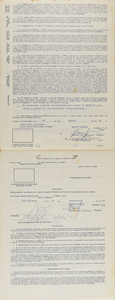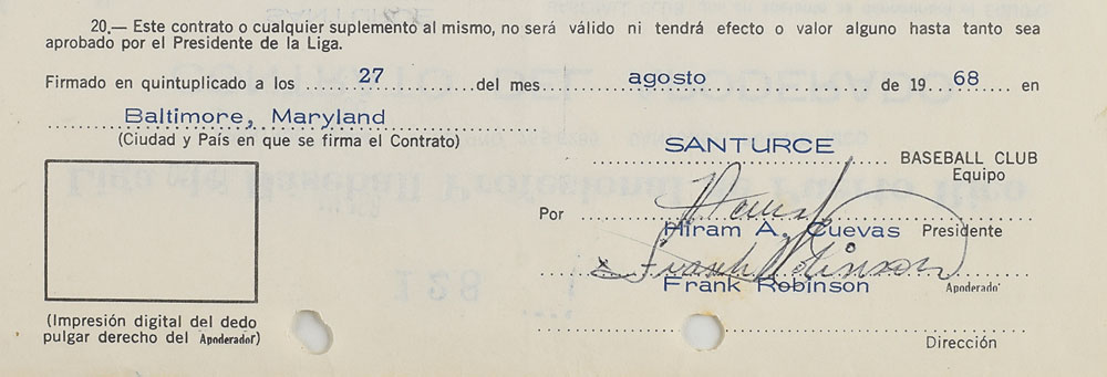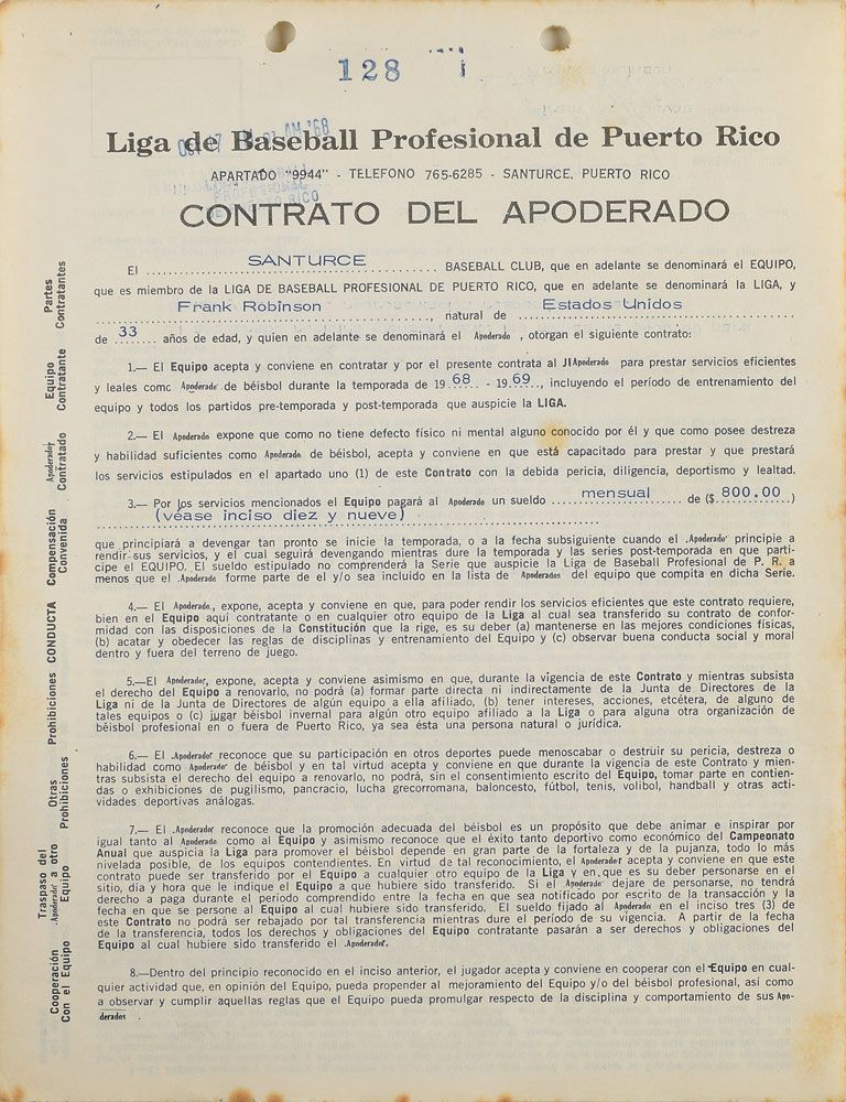 Sought-after contract in Spanish, four pages on two adjoining sheets, 8.5 x 11, August 27, 1968. Professional Baseball League of Puerto Rico contract in which Frank Robinson, "a native of the United States," agrees to "provide efficient and loyal services as a baseball player during the 1968-1969" season for the Santurce baseball club, including the period of team training and all preseason and postseason games sponsored by the league, for a monthly salary of $800, with a subsection noting “the representative will receive monthly sums of $400 per diem and expenses of representation respectively.” Signed on the second page in black ballpoint by Robinson, and countersigned twice by the team's general manager, Hiram Cuevas, and by an official of the Puerto Rico Baseball League. In fine condition, with a few spots of staining. Two seasons removed from his Triple Crown accomplishment in the American League, Robinson obviously still needed supplemental income to support his lifestyle. My how things have changed since the Curt Flood/free agency 'emancipation'! Accompanied by a full letter of authenticity from PSA/DNA.