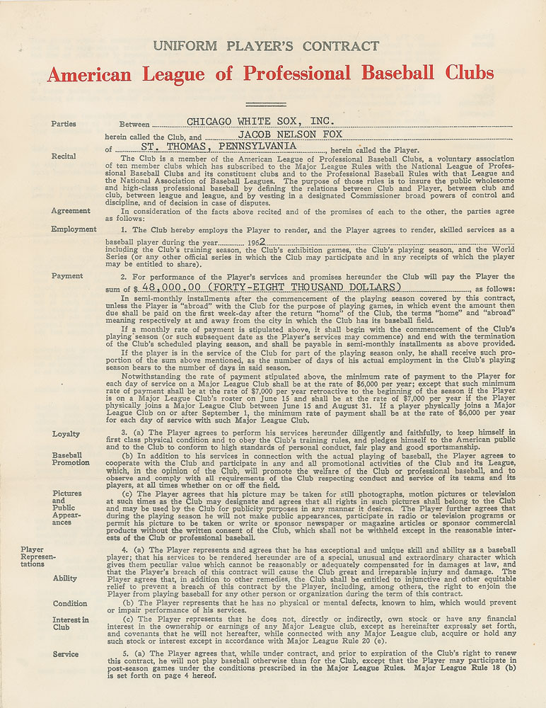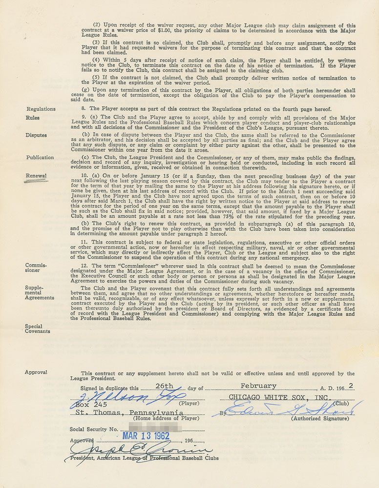 Contract, signed “J. Nelson Fox,” four pages on two adjoining sheets, 8.5 x 11, February 26, 1962. American League uniform player's contract in which Nellie Fox agrees to render "skilled services as a baseball player during the year 1962" for the Chicago White Sox, for a salary of $48,000 per season. Signed at the conclusion in in blue ballpoint by Fox and countersigned by White Sox General Manager Ed Short and American League President Joe Cronin. In fine condition. Pre-certified PSA/DNA.
