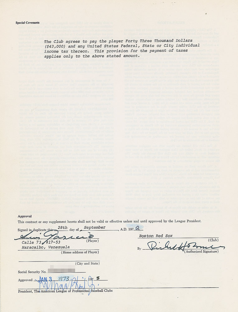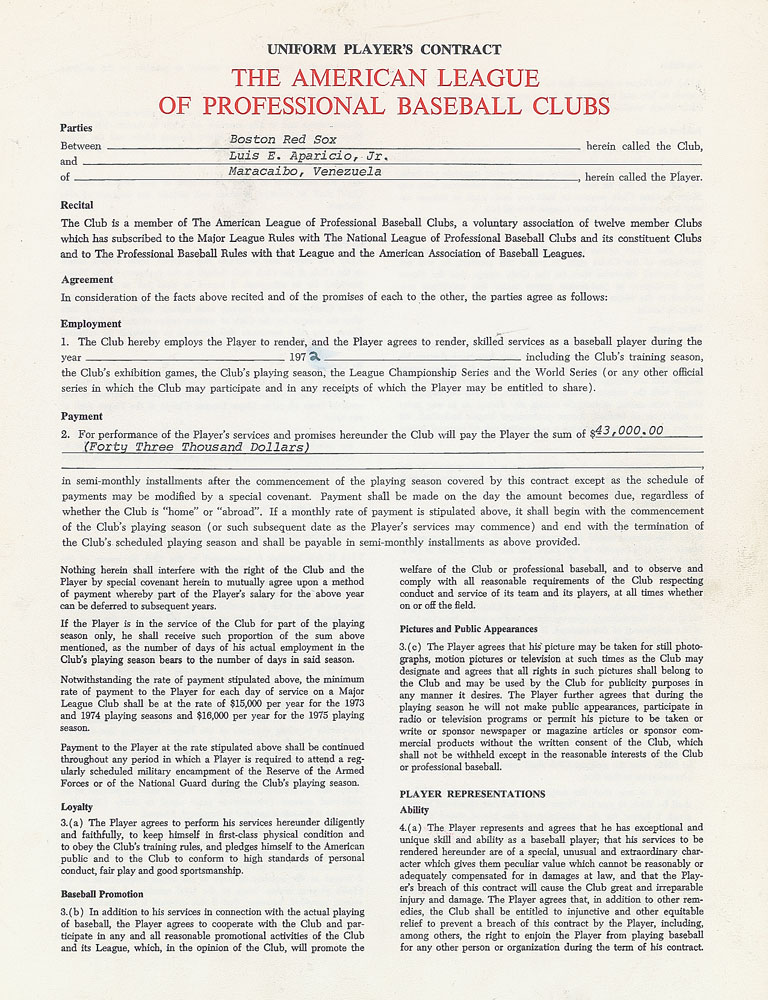 Contract, six pages on three adjoining sheets, 8.5 x 11, September 28, 1972. American League uniform player’s contract in which Luis Aparicio agrees to render “skilled services as a baseball player during the year 1972,” for the Boston Red Sox, for a salary of $43,000. Signed at the conclusion in black ink by Aparicio and countersigned by Red Sox General Manager Dick O'Connell and American League President Lee MacPhail. The special covenant section notes that the team will pay Aparicio $43,000 “and any United States Federal, State or City individual income tax thereon.” In fine condition. Pre-certified PSA/DNA.