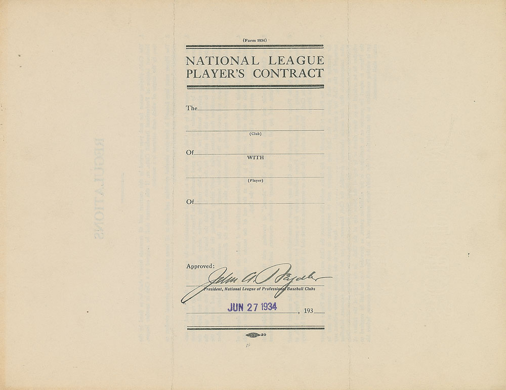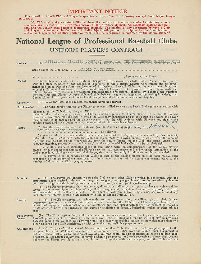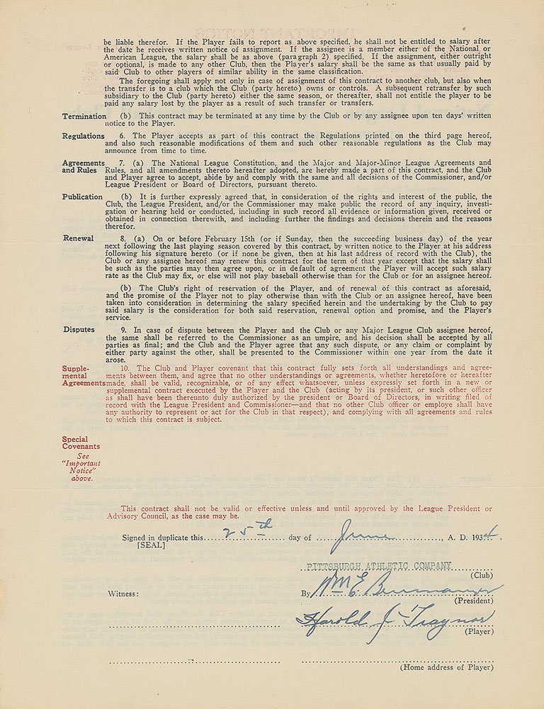 Contract, signed “Harold J. Traynor,” four pages on two adjoining sheets, 8.5 x 11, June 25, 1934. National League uniform player’s contract in which Pie Traynor agrees to render "skilled service as a baseball player?during the year of 1934" for the Pittsburgh Pirates, for a salary of $14,000. Signed at the conclusion in fountain pen by Traynor and countersigned by Pirates Owner Bill Benswanger. The reverse is signed by National League President John Heydler. In fine condition. Accompanied by a full letter of authenticity from PSA/DNA.