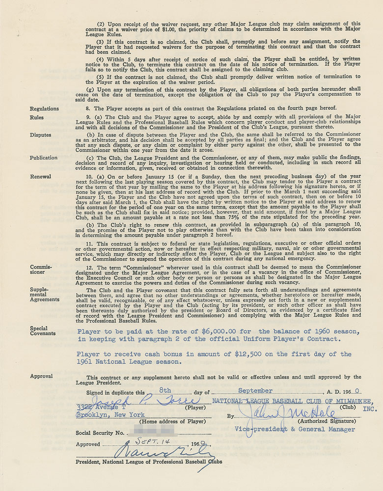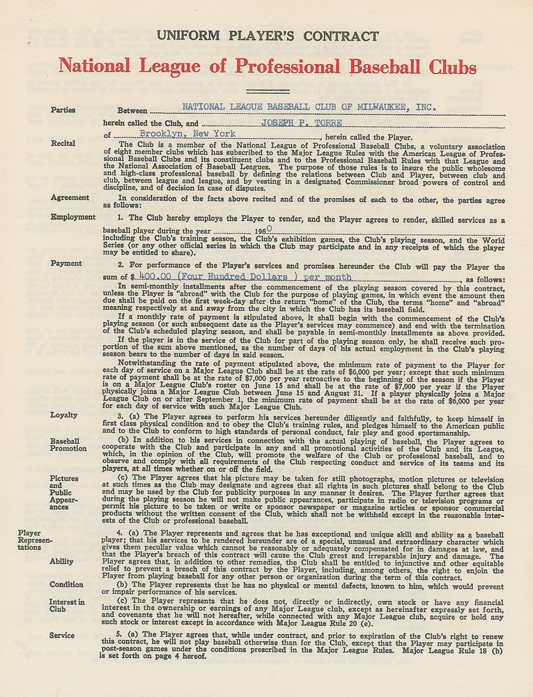 Contract, signed “Joseph P. Torre,” four pages on two adjoining sheets, 8.5 x 11, September 8, 1960. National League uniform player’s contract in which a 20-year-old Joe Torre agrees to render “skilled services as a baseball player during the year 1960,” for the Milwaukee Braves, for a monthly salary of $400. Signed at the conclusion in blue ballpoint pen by Torre and countersigned by Braves General Manager John McHale and National League President Warren Giles. The special covenant section notes that Torre will be paid $6,000 for the balance of the 1960 season and that he will receive a $12,500 cash bonus on the first day of the 1961 season. In fine condition. Torre appeared in two games for the Braves in the waning days of the 1960 season, before becoming their regular catcher the next year. Pre-certified PSA/DNA.