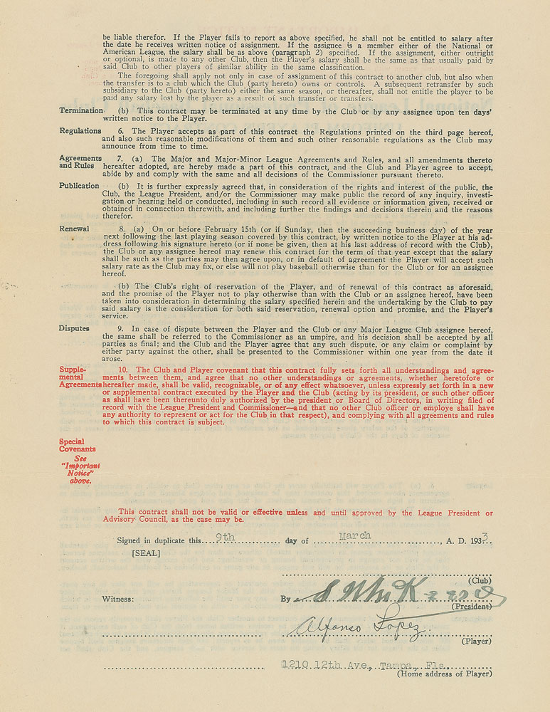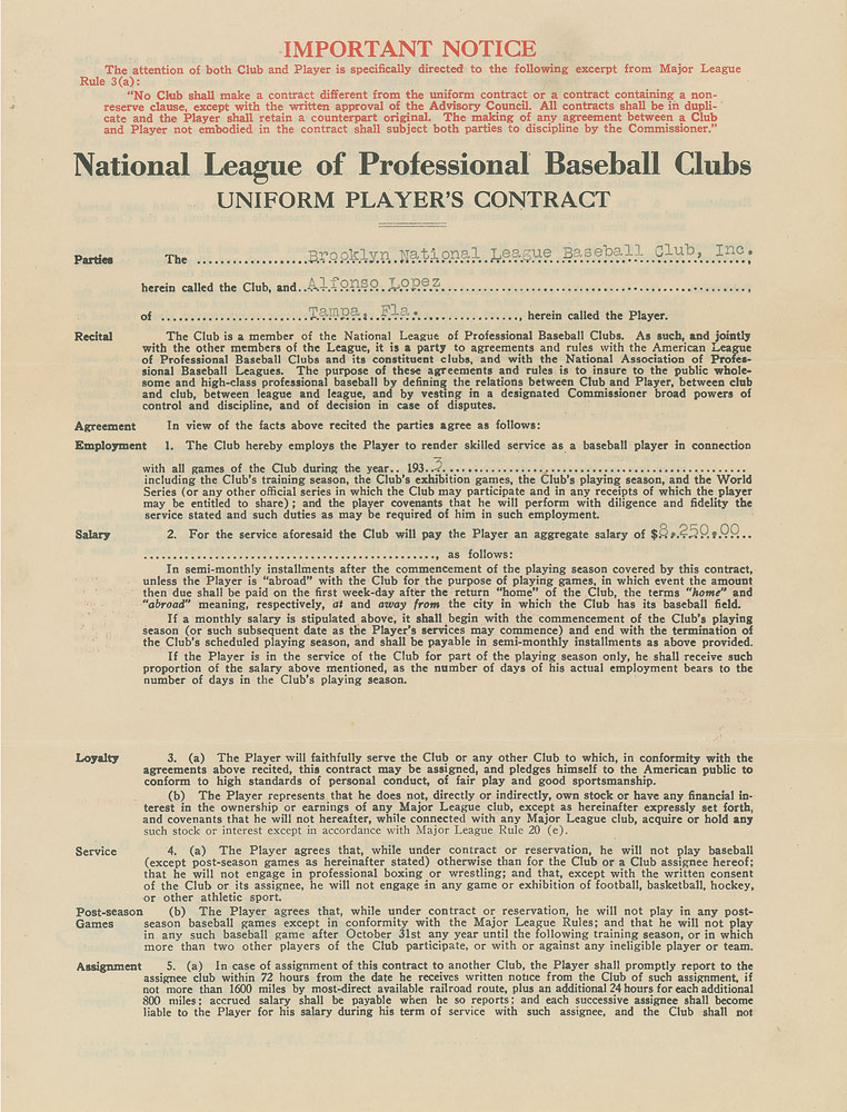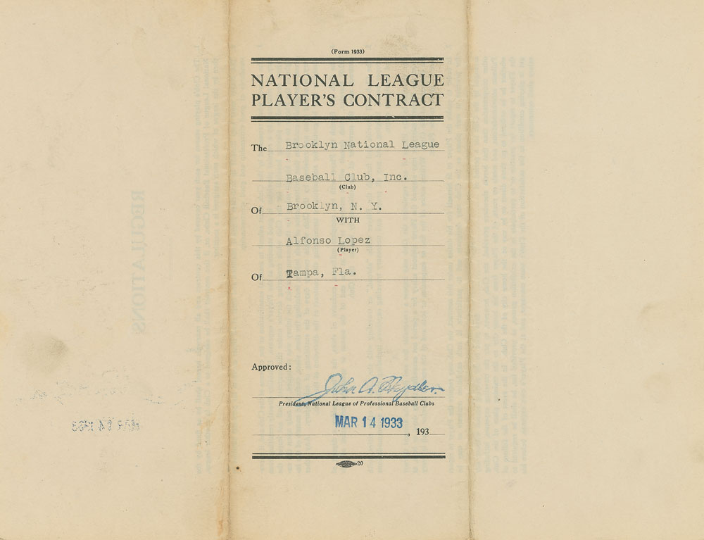 Contract, signed “Alfonso Lopez,” four pages on two adjoining sheets, 8.5 x 11, March 9, 1933. National League uniform player's contract in which Al Lopez agrees to render "skilled service as a baseball player in connection with all games of the Club during the year 1933" for the Brooklyn Dodgers, for a salary of $8,250. Signed at the conclusion in fountain pen by Lopez, and countersigned by Dodgers owner and president Stephen McKeever. The reverse bears a stamped signature of National League President John A. Heydler. In fine condition. The 1933 season saw a conclusive shift in Brooklyn's team name: having been called the 'Superbas' and 'Robins' in the past, 1933 marked the first time that 'Dodgers' was formally used on both home and road uniforms. A modest hitter known for his defense behind the plate, Lopez had his best offensive campaign in 1933, hitting .301, stealing ten bases, and finishing tenth in the National League MVP voting. Accompanied by a full letter of authenticity from PSA/DNA.