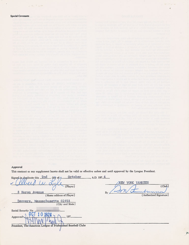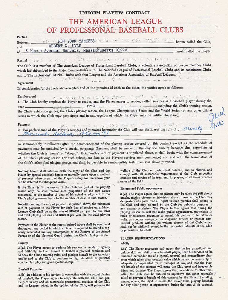 Contract, signed “Albert W. Lyle” and “G. M. Steinbrenner,” six pages on three adjoining sheets, 8.5 x 11, October 2, 1974. American League uniform player’s contract in which Sparky Lyle agrees to render "skilled services as a baseball player during the year 1975” for the New York Yankees, for a salary of $90,000. Signed at the conclusion in blue ballpoint by both Lyle and Steinbrenner, and countersigned by American League President Lee MacPhail. Both Lyle and Steinbrenner add their initials to the payment section. In fine condition. Accompanied by a full letter of authenticity from PSA/DNA.