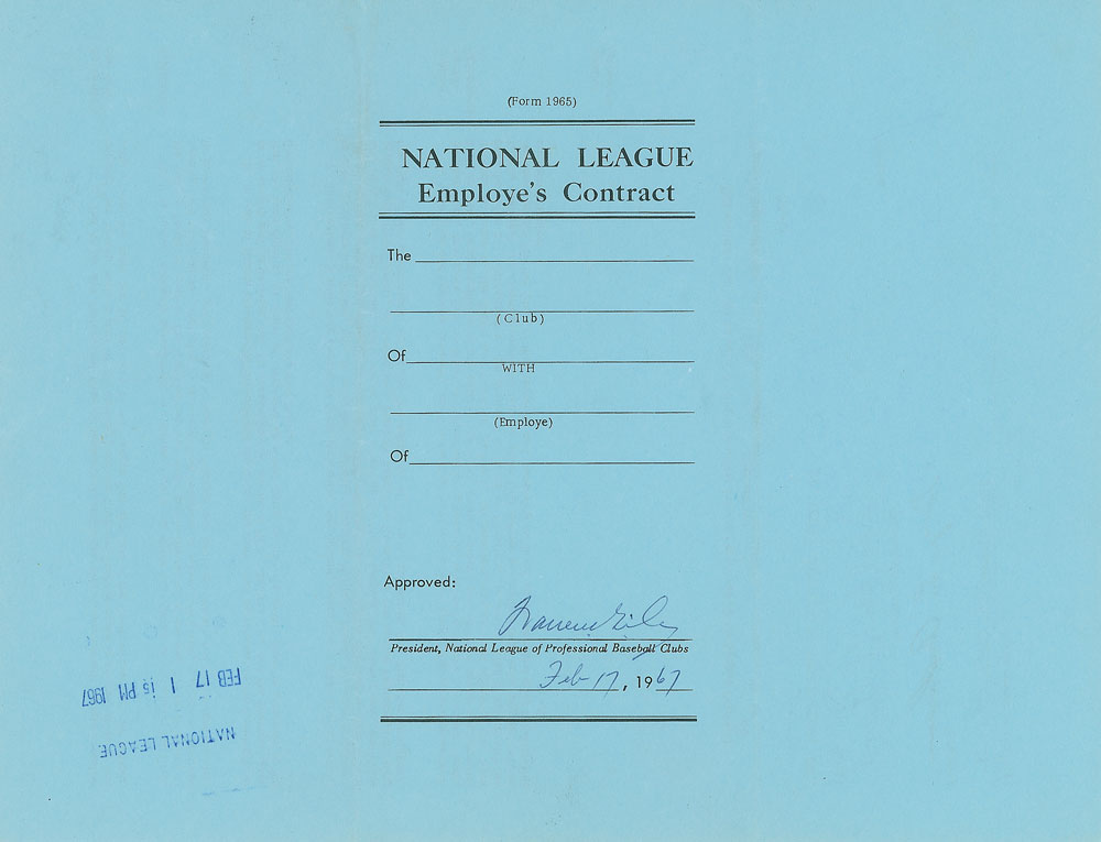 Contract, signed “George L. Anderson,” four pages on two adjoining sheets, 8.5 x 11, September 15, 1966. National League uniform employee’s contract in which Sparky Anderson agrees to render "skilled service as a baseball Instructor?during the year 10/1/66 to 9/30/67” for the St. Louis Cardinals minor league system, for a monthly salary of $795. Signed at the conclusion in black ballpoint by Anderson and countersigned by Sheldon ‘Chief’ Bender. The reverse is signed by National League President Warren Giles. In fine condition. Pre-certified PSA/DNA.