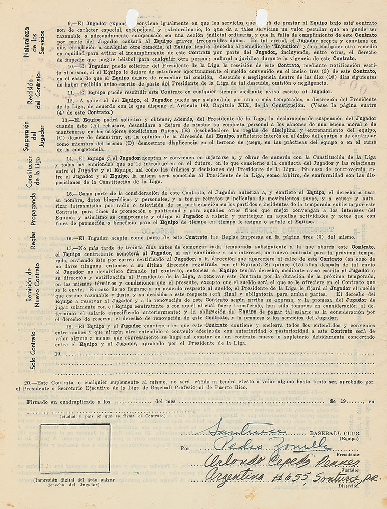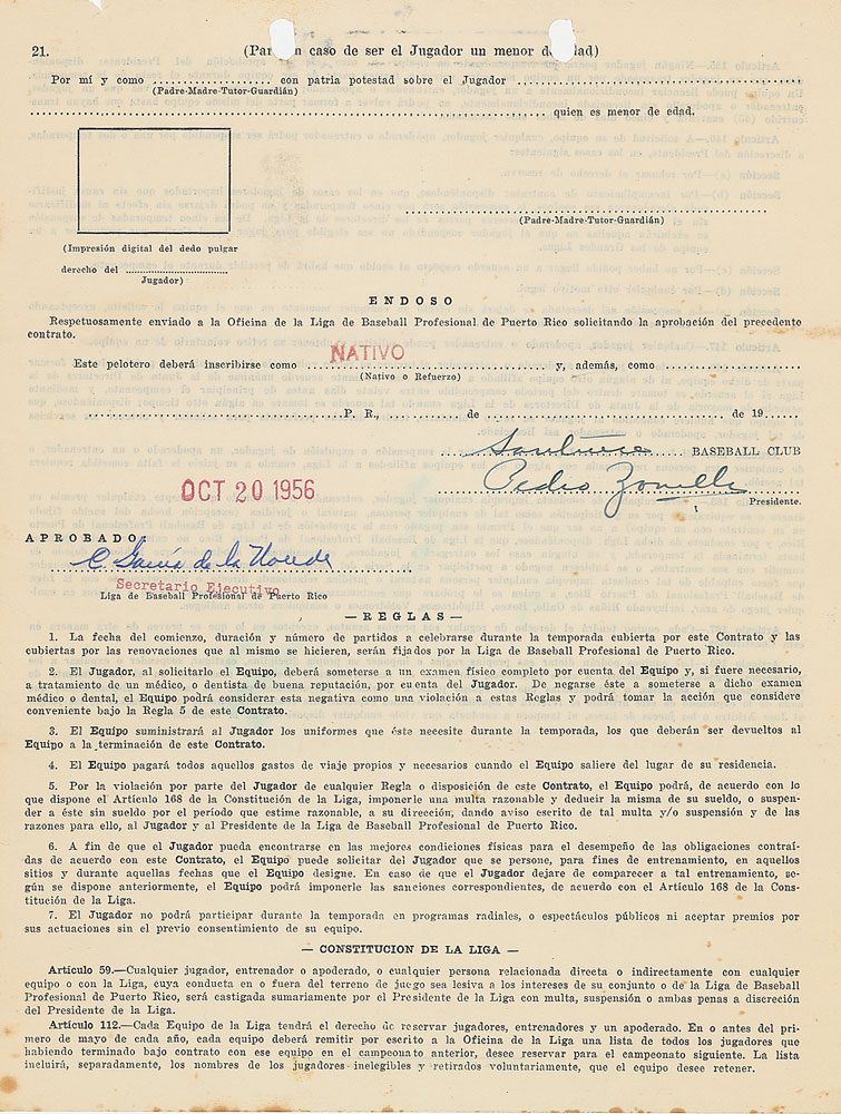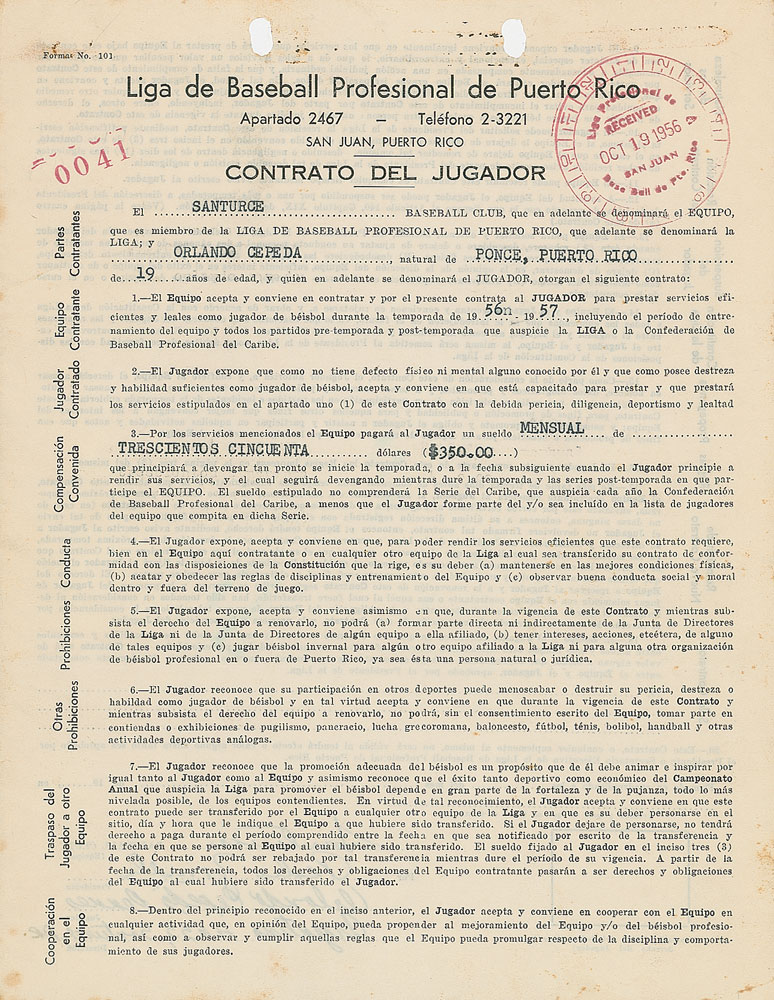 Rare contract in Spanish, signed “Orlando Cepeda Pennes,” four pages on two adjoining sheets, 8.5 x 11, stamp-dated October 19, 1956. Professional Baseball League of Puerto Rico contract in which a 19-year-old Orlando Cepeda, "a native of Ponce, Puerto Rico," agrees to "provide efficient and loyal services as a baseball player during the 1956-1957" season for the Santurce baseball club, including the period of team training and all preseason and postseason games sponsored by the league, for a monthly salary of $350. Signed on the second page in black ink by Cepeda, who adds his address, "Argentina #655 Santurce, P. R." Countersigned twice by the team's general manager, Pedro Zorrilla, and an official of the Puerto Rico Baseball League. In very good to fine condition, with punch holes to upper border, and some scattered spotting and staining.