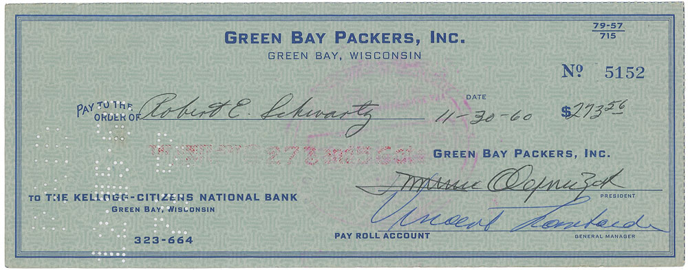 Green Bay Packers, Inc. business check, 8.25 x 3.25, filled out in another hand and signed by Lombardi as general manager, "Vincent Lombardi" and Dominic Olejniczak as team president, "Dominic Olejniczak," payable to Robert E. Schwartz for $273.50, November 30, 1960. In fine condition. Pre-certified PSA/DNA.