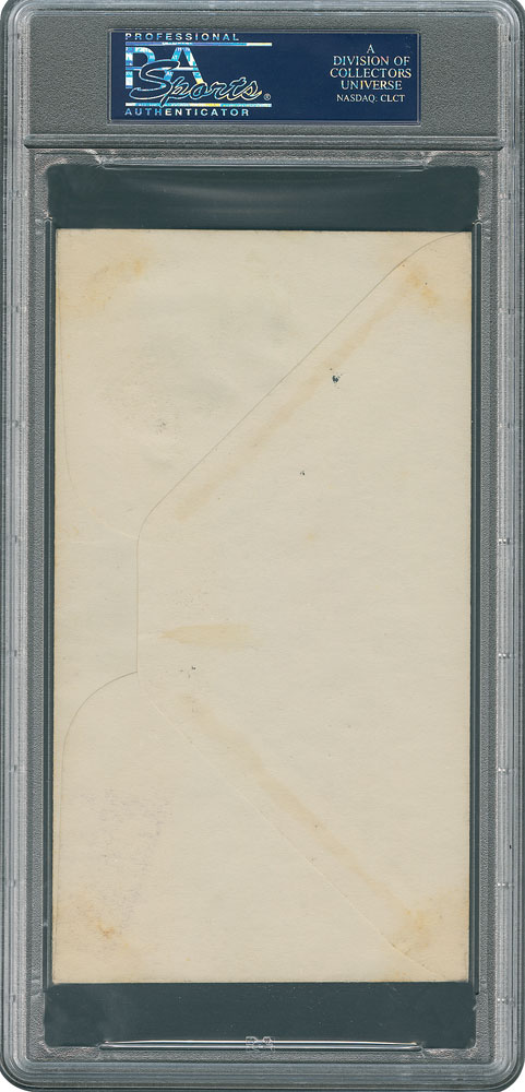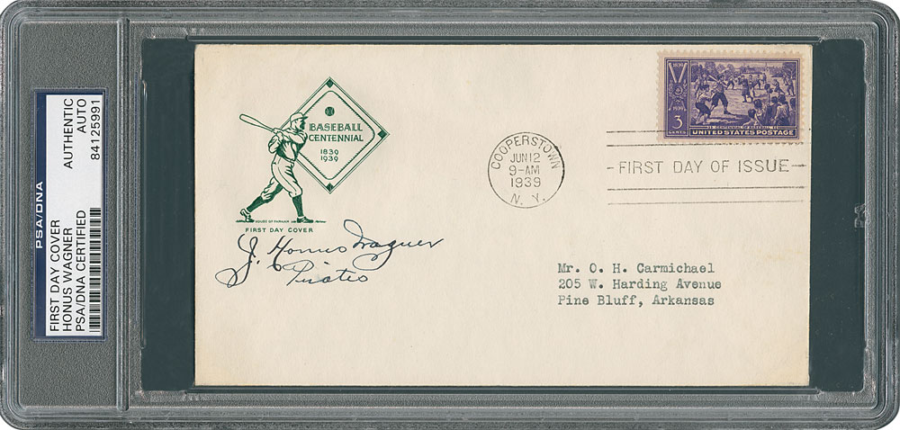 First day cover honoring the centennial of baseball, postmarked at Cooperstown on June 12, 1939, signed in fountain pen, "J. Honus Wagner, Pirates." In fine condition. Accompanied by a full letter of authenticity from JSA. This three-cent postage stamp honoring baseball's 100th anniversary was issued in conjunction with the dedication and opening of the National Baseball Hall of Fame in Cooperstown, New York, on June 12, 1939. Pittsburgh's legendary shortstop, Honus Wagner, was enshrined as a member of the Hall of Fame's first class, which had been elected in 1936. Encapsulated in a PSA/DNA authentication holder.