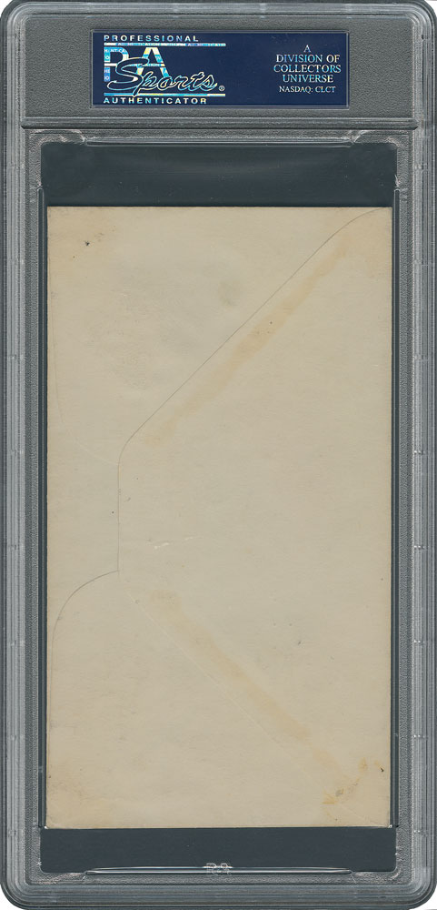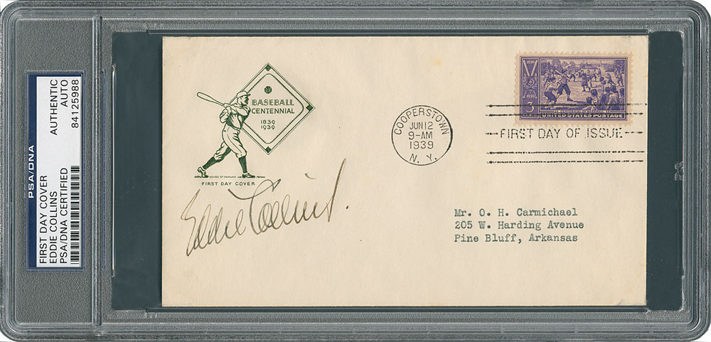 First day cover honoring the centennial of baseball, postmarked at Cooperstown on June 12, 1939, signed in fountain pen, "Eddie Collins." In fine condition. Accompanied by a full letter of authenticity from JSA. This three-cent postage stamp honoring baseball's 100th anniversary was issued in conjunction with the dedication and opening of the National Baseball Hall of Fame in Cooperstown, New York, on June 12, 1939. Eddie Collins, a six-time World Series champ and member of the 3,000 Hit Club, was elected to the Hall in 1939. Encapsulated in a PSA/DNA authentication holder.