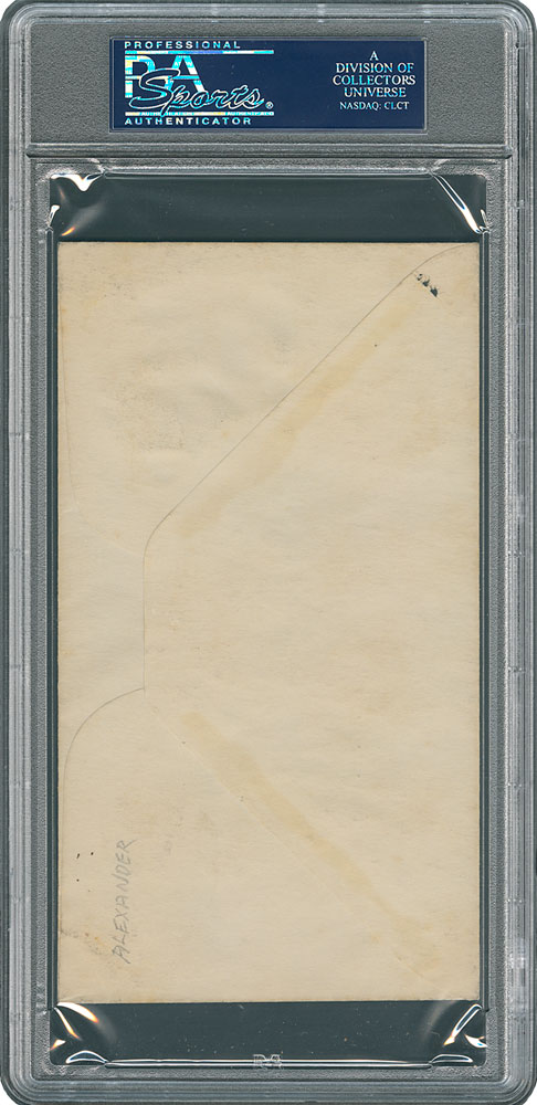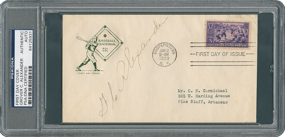 First day cover honoring the centennial of baseball, postmarked at Cooperstown on June 12, 1939, signed in fountain pen, "G. C. Alexander." In fine condition. This three-cent postage stamp honoring baseball's 100th anniversary was issued in conjunction with the dedication and opening of the National Baseball Hall of Fame in Cooperstown, New York, on June 12, 1939. One of the greatest right-handed pitchers of the teens, Alexander won three Pitching Triple Crowns during his storied career, and was elected as a Hall of Famer in 1938. Encapsulated in a PSA/DNA authentication holder.
