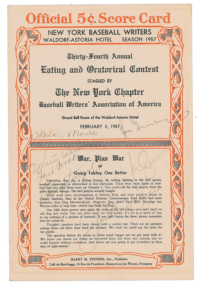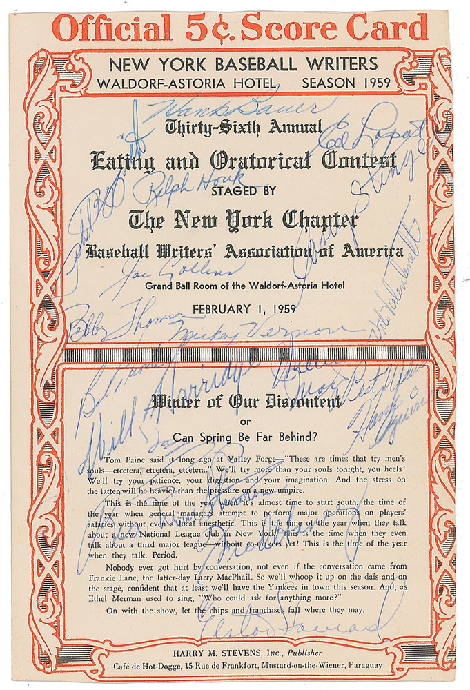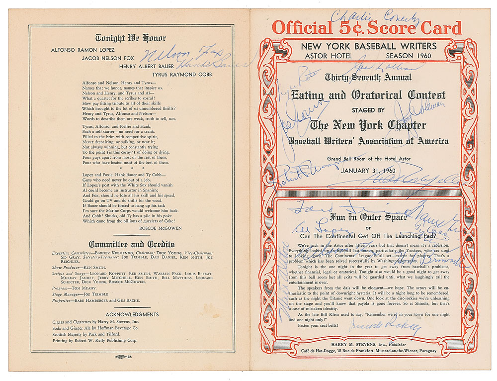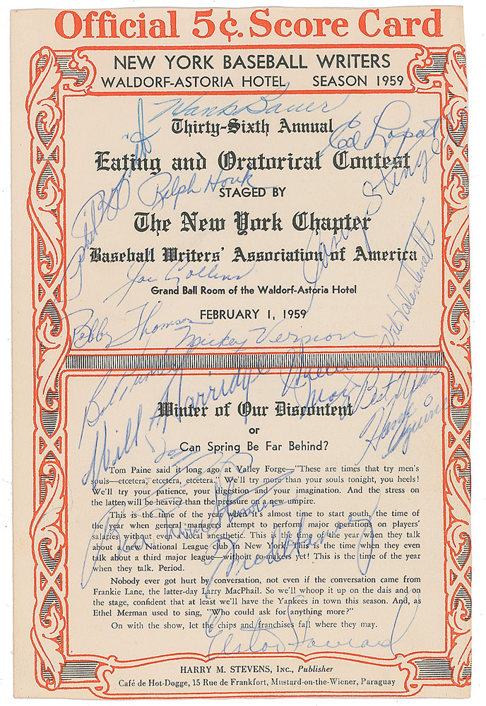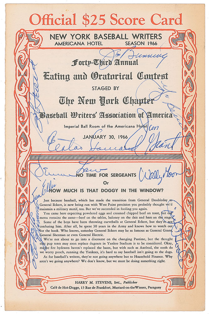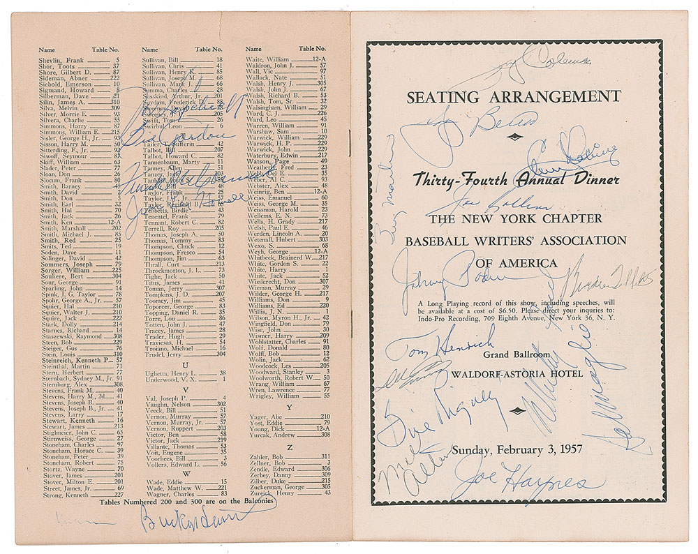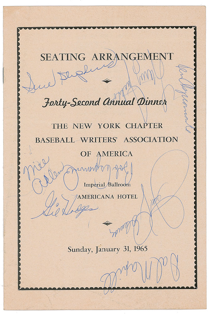 Extraordinary collection of eight menus for annual dinners of the New York Chapter of the Baseball Writers' Association of America, dating from 1934 to to 1966, signed by more than 100 baseball players and other guests (including other athletes, league executives, broadcasters, and politicians), with highlights including Hall of Famers Lou Gehrig, Walter Johnson, Ty Cobb, Roberto Clemente, Carl Hubbell, Joe DiMaggio, Mickey Mantle, Yogi Berra, Casey Stengel, Hank Greenberg, Joe Cronin, Walt Alston, Branch Rickey, Brooks Robinson, Whitey Ford, Bucky Harris, Bill Veeck, and more. In overall very good to fine condition.