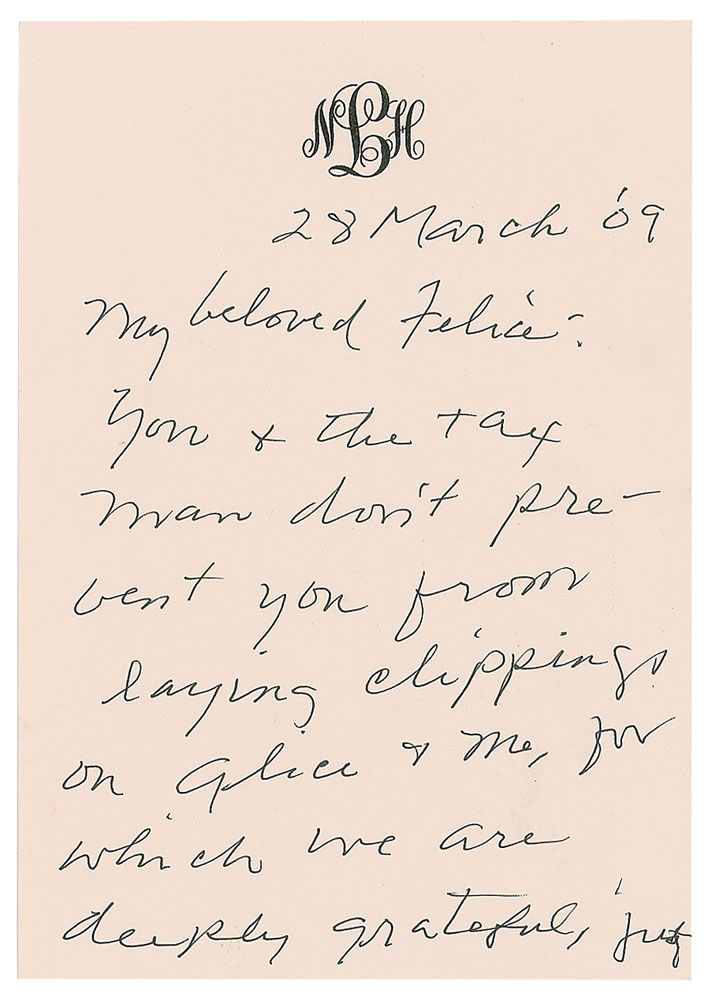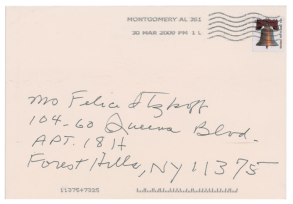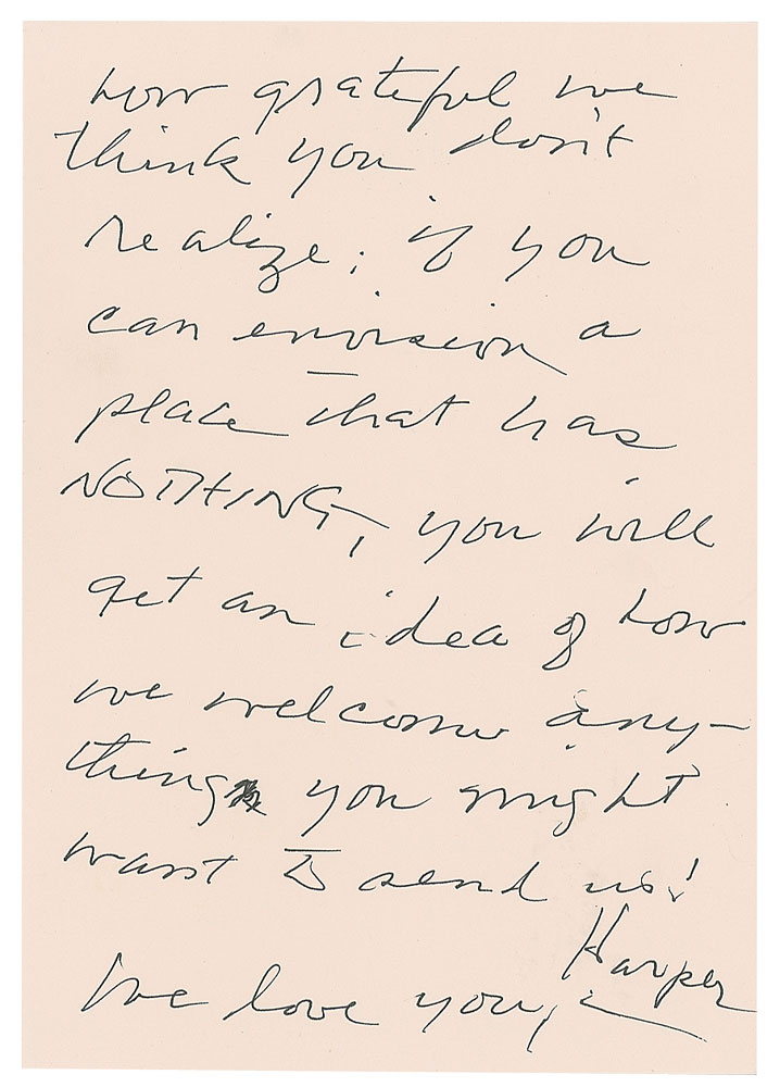 ALS signed “Harper,” one page both sides, 5.25 x 7.5, personal letterhead, March 28, 2009. Letter to her friend Felice Itzkoff, in full: "You & the tax man don't prevent you from laying clippings on Alice & me, for which we are deeply grateful, just how grateful we think you don't realize; if you can envision a place that has NOTHING, you will get an idea of how we welcome anything you might want to send us!" In very fine condition. Accompanied by the original mailing envelope addressed in Lee's hand.