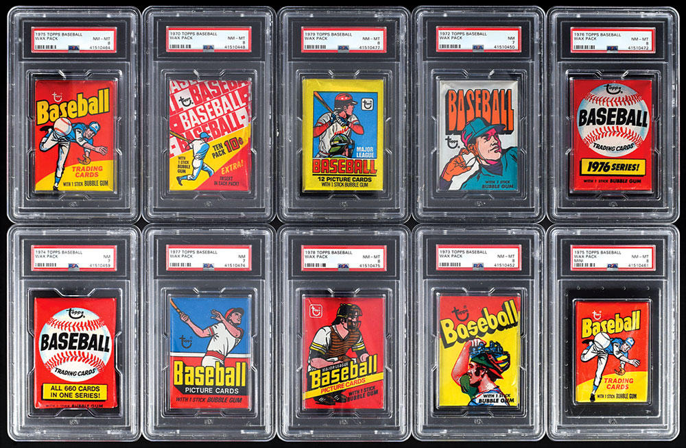 All eleven (11) packs have been authenticated and graded by PSA, and derive from a closely held collection of high grade cards and original Topps wax packs. Each pack grades at the PSA NM 7 or PSA NM-MT 8 levels, and is a great start to building a high grade original Topps wax pack collection.