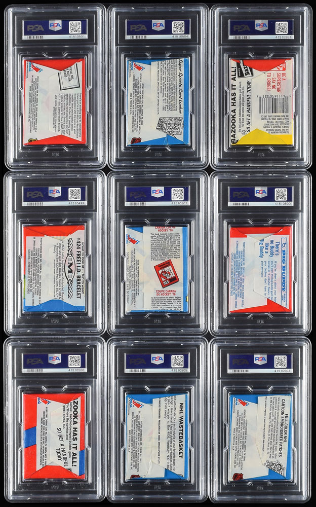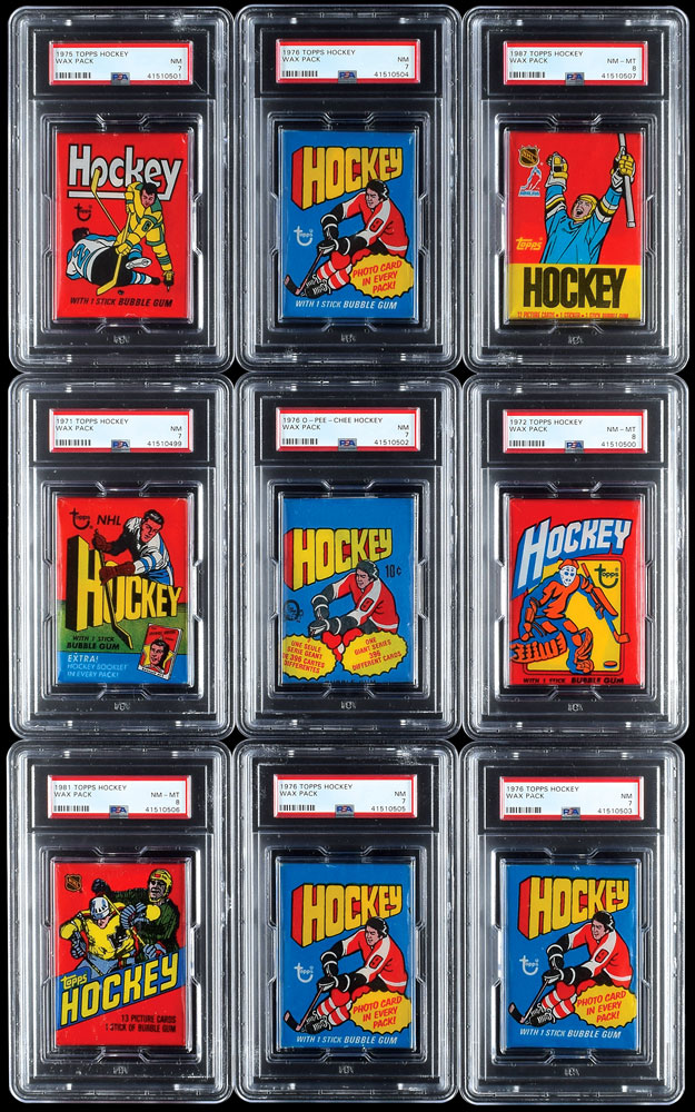 Includes: 1971 Topps - Hockey Booklet in every pack! (PSA NM 7), 1972 Topps (PSA NM-MT 8), 1975 Topps (PSA NM 7), 1976 Topps (3, all PSA NM 7), 1976 OPC (PSA NM 7), 1981 Topps (PSA NM-MT 8) and 1987 Topps (PSA NM-MT 8).