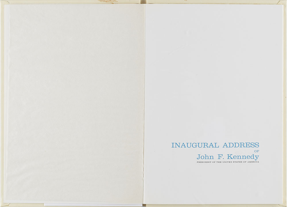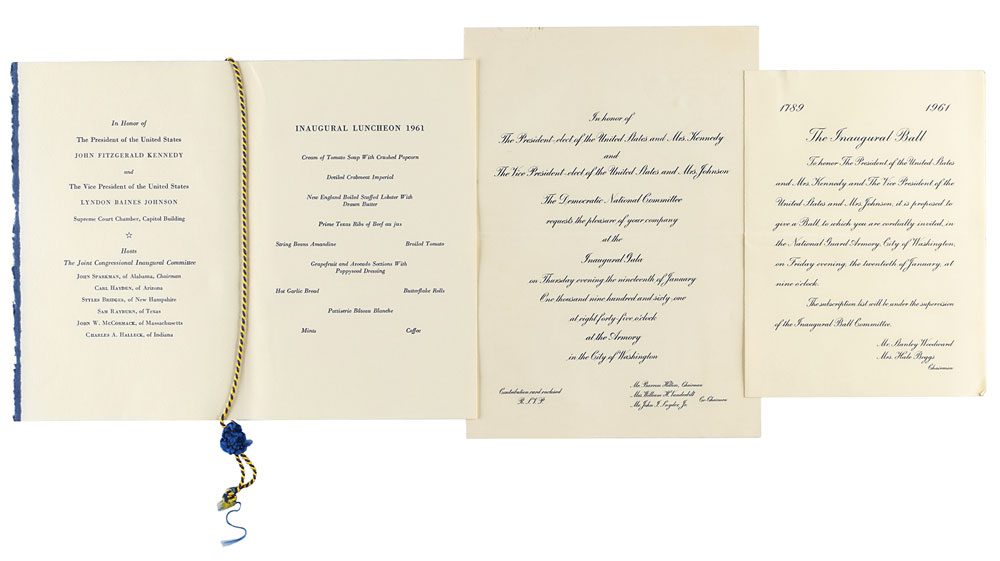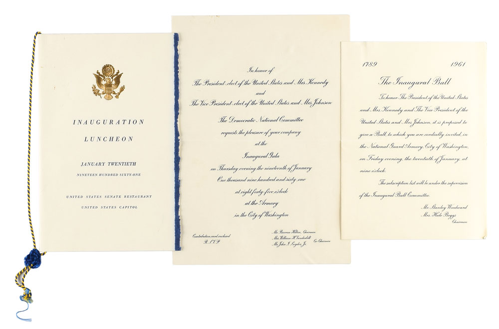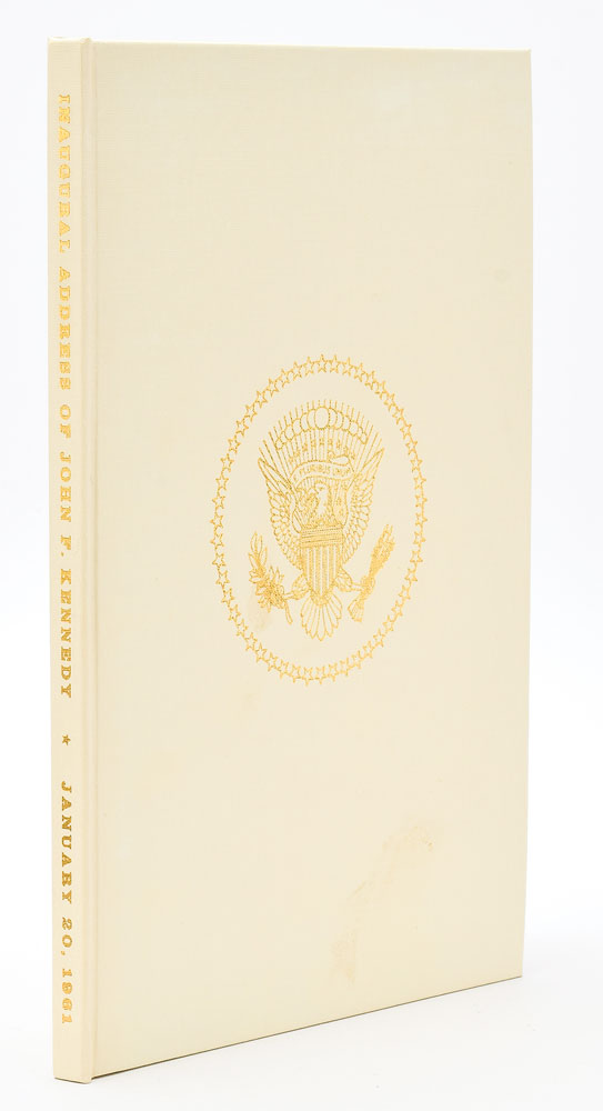 Group lot of items relating to the Presidential Inauguration of John F. Kennedy, including: a scarce copy of the Inaugural Address of John F. Kennedy, cloth-bound hardcover with matching gilt-embossed slipcase, eight pages, 7 x 10.25, with accompanying presentation photo bearing a preprinted sentiment from Kennedy to “Mr. Donald S. Carmichael”; a menu for the Inauguration Luncheon on January 20, 1961, at the United States Senate Restaurant, two pages, 5.5 x 8.5, with embossed eagle and blue-and-gold roping; an invitation for the Inaugural Gala at the Armory in the City of Washington on January 19, 1961, with response card and envelope, and original mailing envelope addressed to Donald S. Carmichael; an invitation to the Inaugural Ball at the National Guard Armory on January 20, 1961, with response card and envelope; and four additional presentation photos of Kennedy, each bearing a preprinted sentiment to Carmichael. The Inaugural Address book is housed in a cloth-bound clamshell case. In overall fine condition. Accompanied by a letter of provenance from Glenn Horowitz Bookseller citing that the copy of “President Kennedy’s Inaugural Address…came from the collection of Dave Powers, JFK’s longtime political aide who served as the first Director of the Kennedy Library.” From the estate of Donald Carmichael.