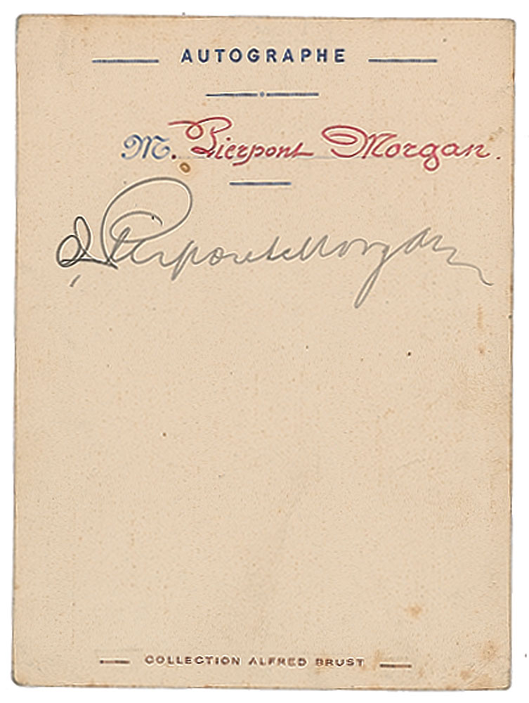 Ink signature, "J. Pierpont Morgan,” on an off-white 4 x 5.5 card imprinted with "Collection Alfred Brust." In fine condition, with a bit of light foxing.