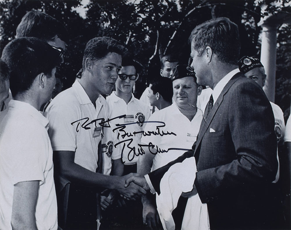 Satin-finish 14 x 11 photo of Boys Nation delegate Bill Clinton shaking hands with President John F. Kennedy at the White House on June 6, 1963, signed and inscribed in black felt tip, "Best wishes, Bill Clinton." In fine condition, with scattered light creasing. From The John Brennan In-person Autograph Collection.