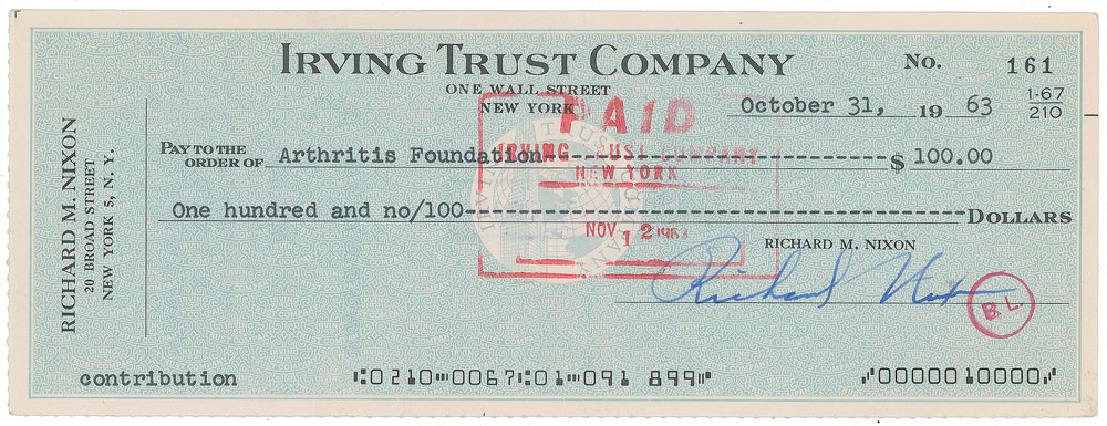 Scarce personal check, 8.25 x 3, filled out in type and signed by Nixon, payable to Arthritis Foundation for $100, October 31, 1963. Lower memo field bears typed notation: "Contribution." In fine condition. After his failed California gubernatorial bid in 1962, Nixon traveled with his family around Europe before moving to New York City and becoming a senior partner in the law firm Nixon, Mudge, Rose, Guthrie & Alexander. According to the Richard M. Nixon Presidential Library, White House Special Files Collection, in 1963, Nixon donated over $9,000 to over 50 beneficiaries ranging from churches, universities, and hospitals to scholarship funds, veterans' groups, and children's organizations.