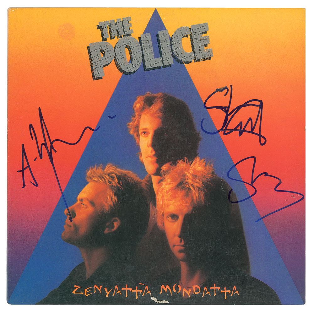 Zenyatta Mondatta album signed on the front cover in blue felt tip by Sting, Andy Summers, and Stewart Copeland. In fine condition, with some old price sticker residue. The record is included. The album won two Grammy Awards including Best Rock Performance for 'Don't Stand So Close to Me' and Best Rock Instrumental Performance for 'Behind My Camel.' From The John Brennan In-person Autograph Collection.