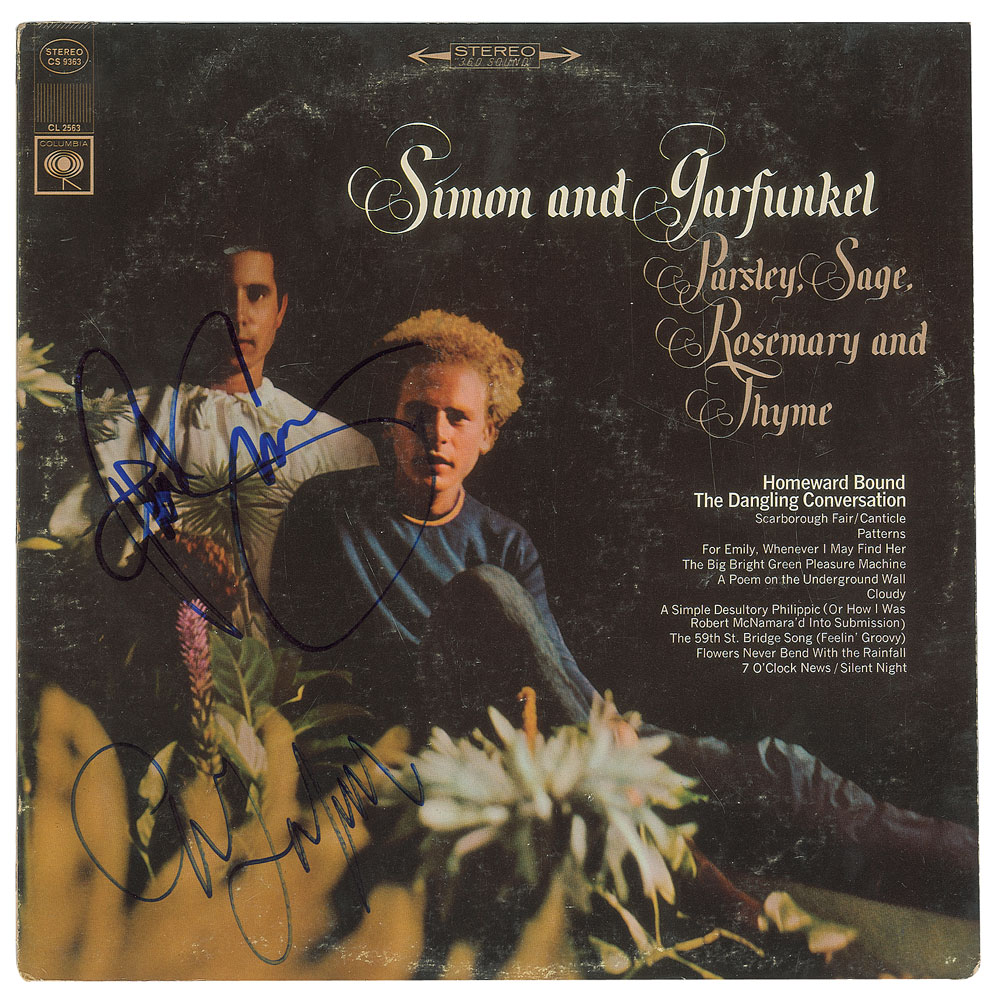 Parsley, Sage, Rosemary and Thyme album signed on the front cover in blue felt tip by Paul Simon and Art Garfunkel. In fine condition, with light scuffing. The record is included. From The John Brennan In-person Autograph Collection.